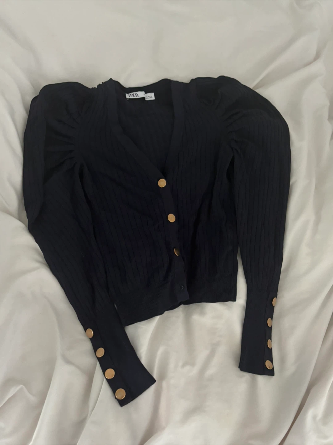 This is a black knit cardigan from Zara. It's a size medium and features gold button details on the cuffs and front closure. The sleeves have a puff detail.