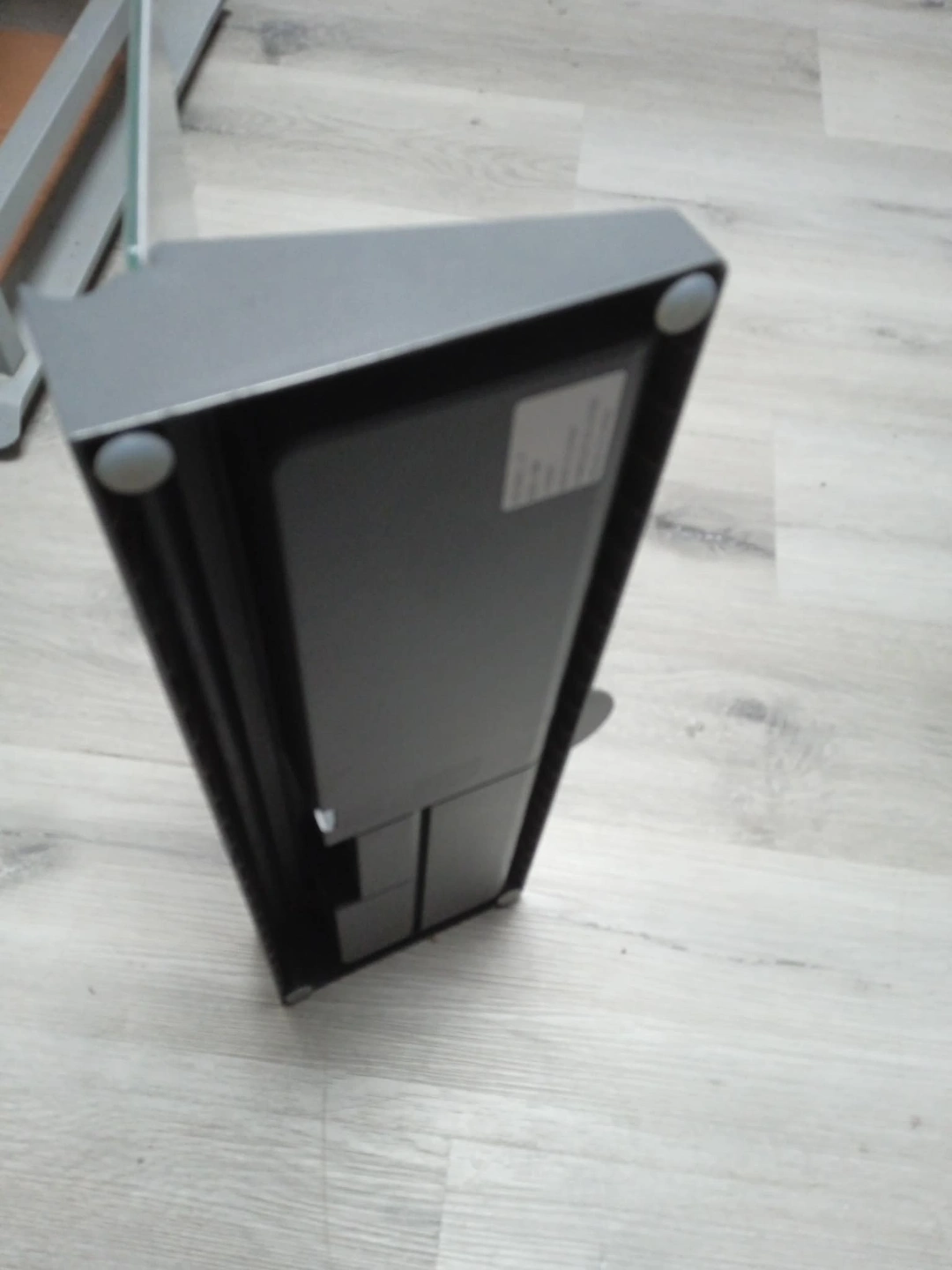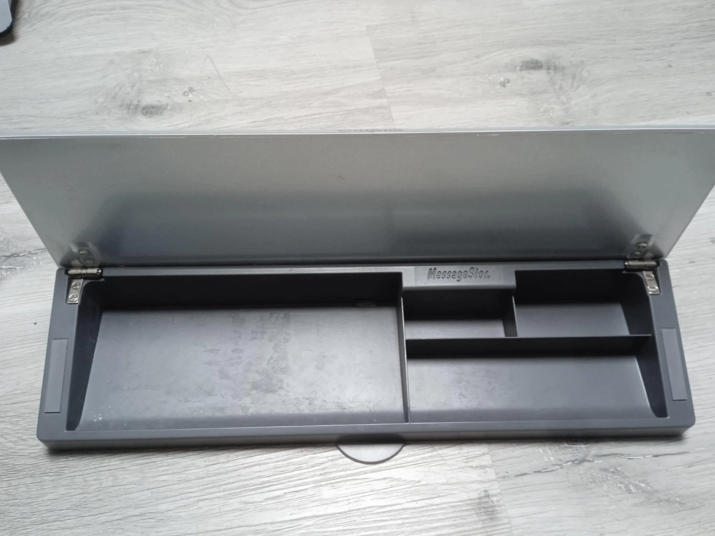 Grey and silver desk organizer. Multiple compartments. Flip-top design. Good for pens, pencils, and other small items. Small scuffs.