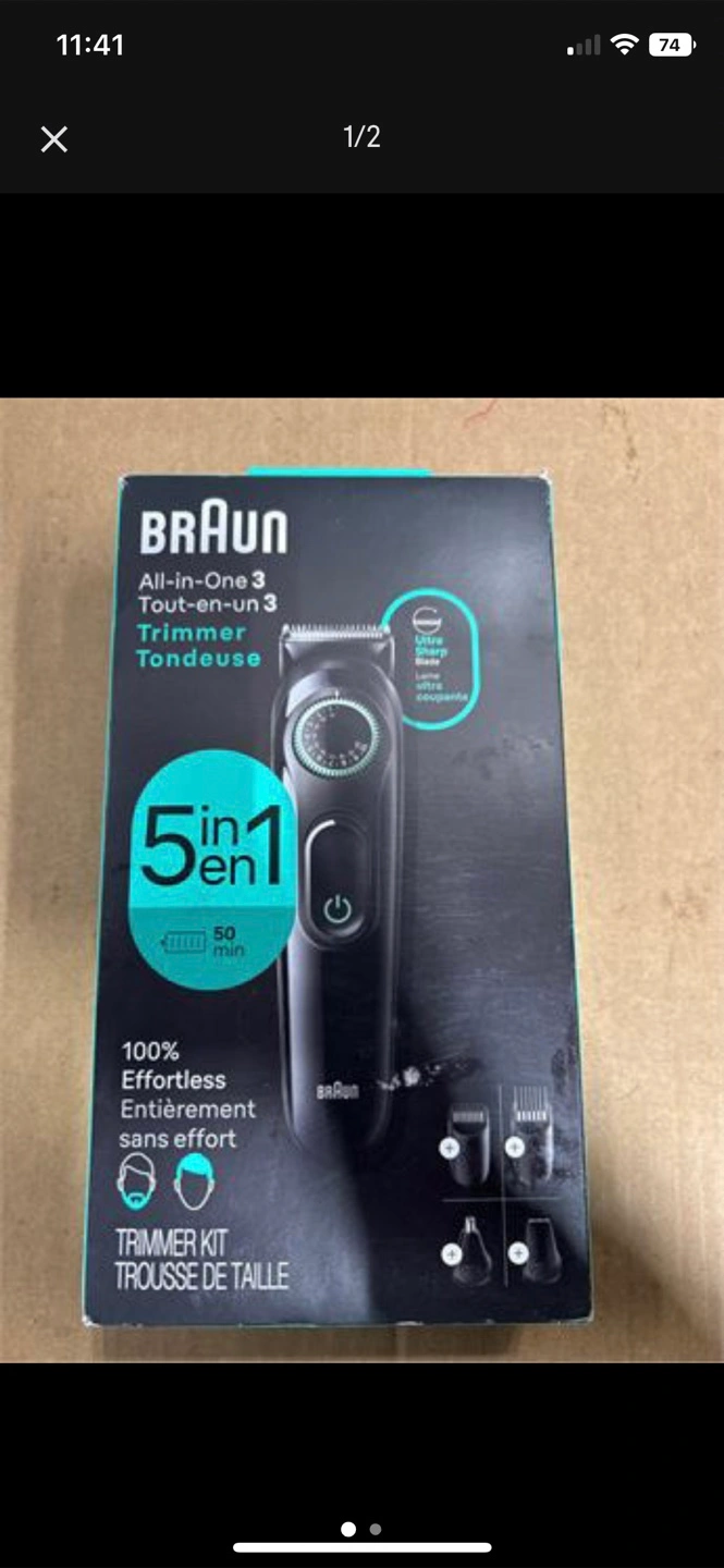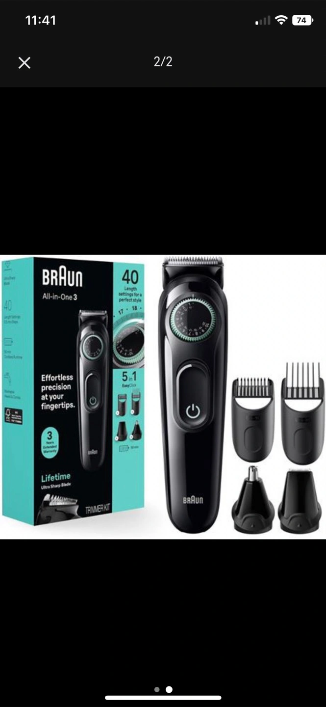 Looking to sell a Braun All-in-One 3 Trimmer Kit! It's perfect for effortless precision right at your fingertips. This trimmer kit includes multiple attachments for various grooming needs. The box is included, so you'll have everything you need to keep it organized