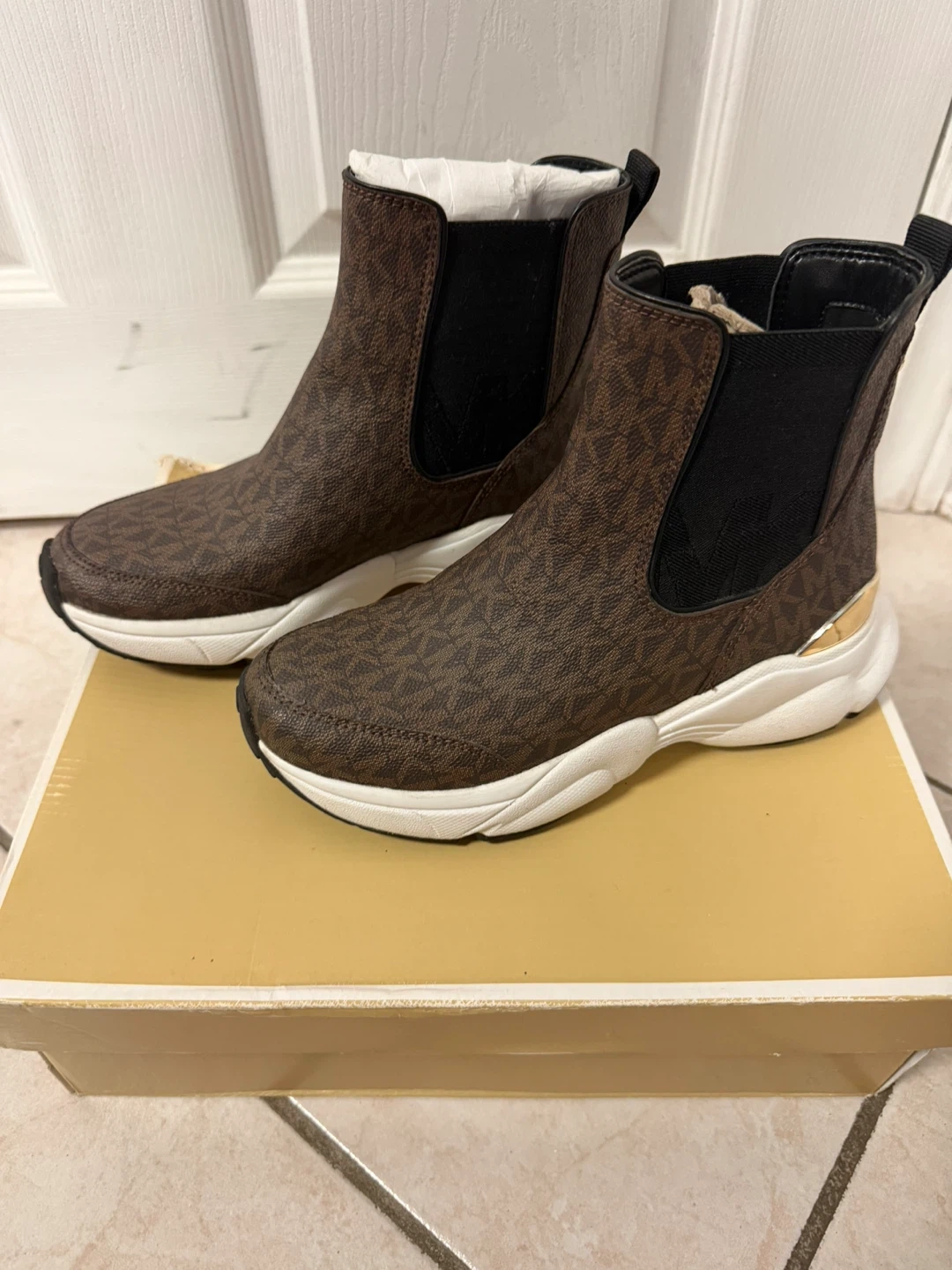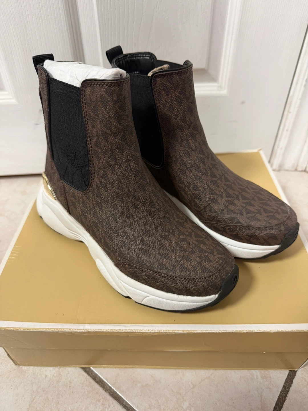 Michael Kors Katrina Bootie in signature brown and black. Size 5M. Features elastic side panels and a white rubber sole with gold accent. Includes original box. rarely been use and you can see from the photos that does not show any folds nor bend near toes area. price is negotiable, low ballers will be ignored. thank you