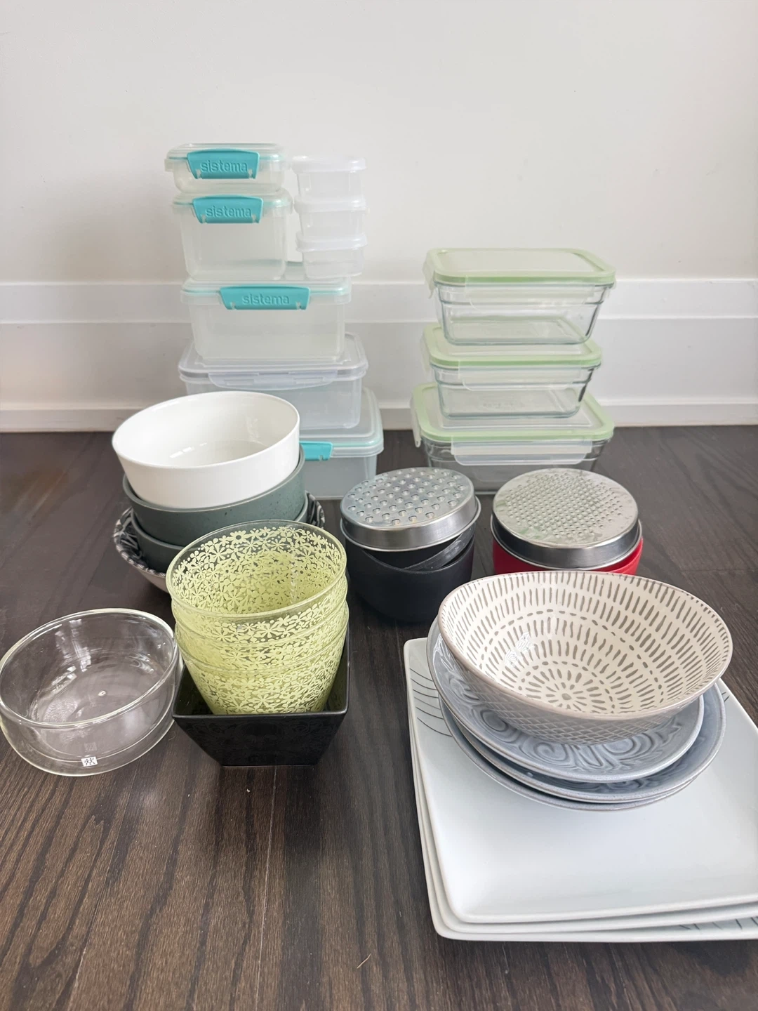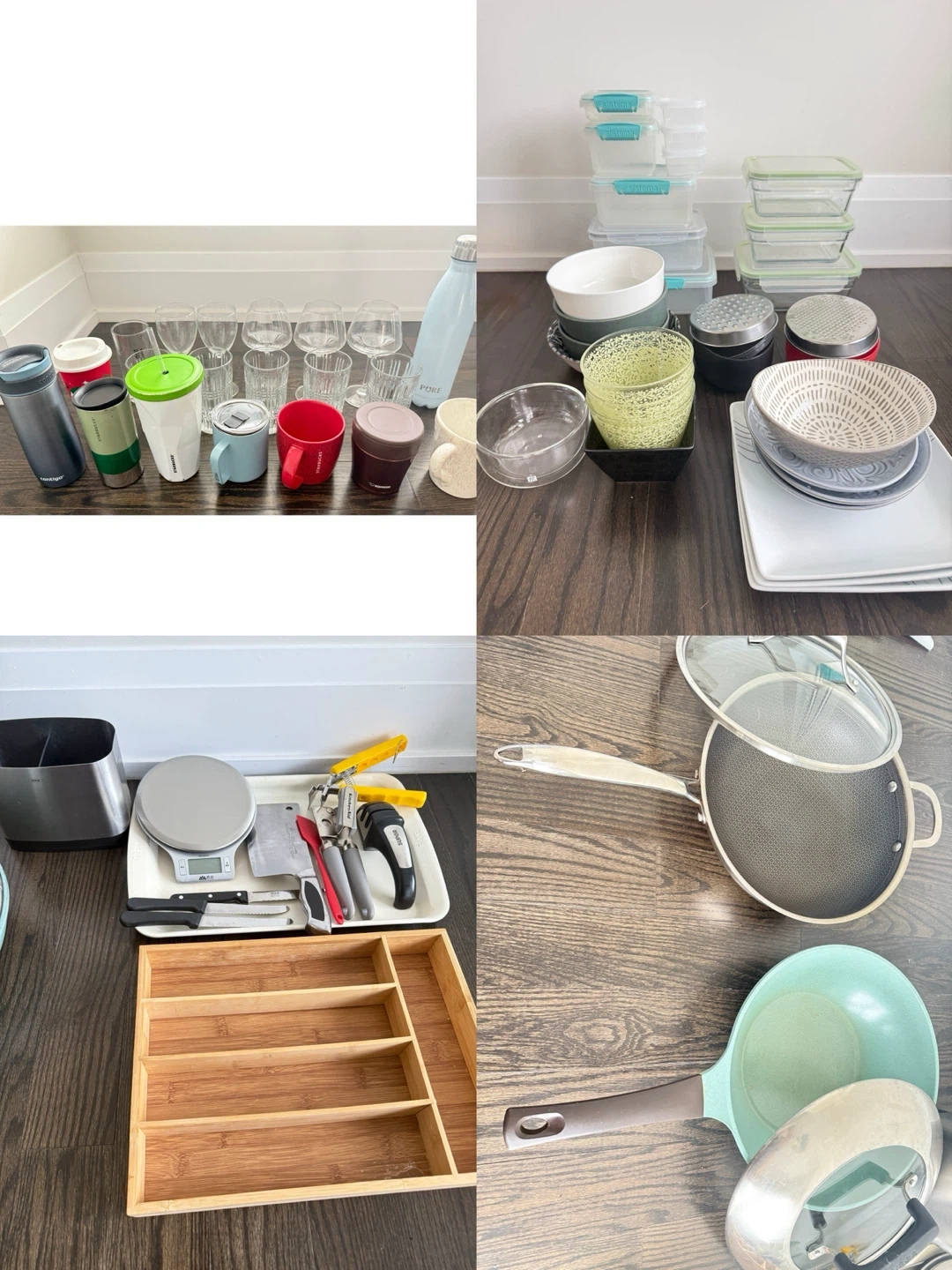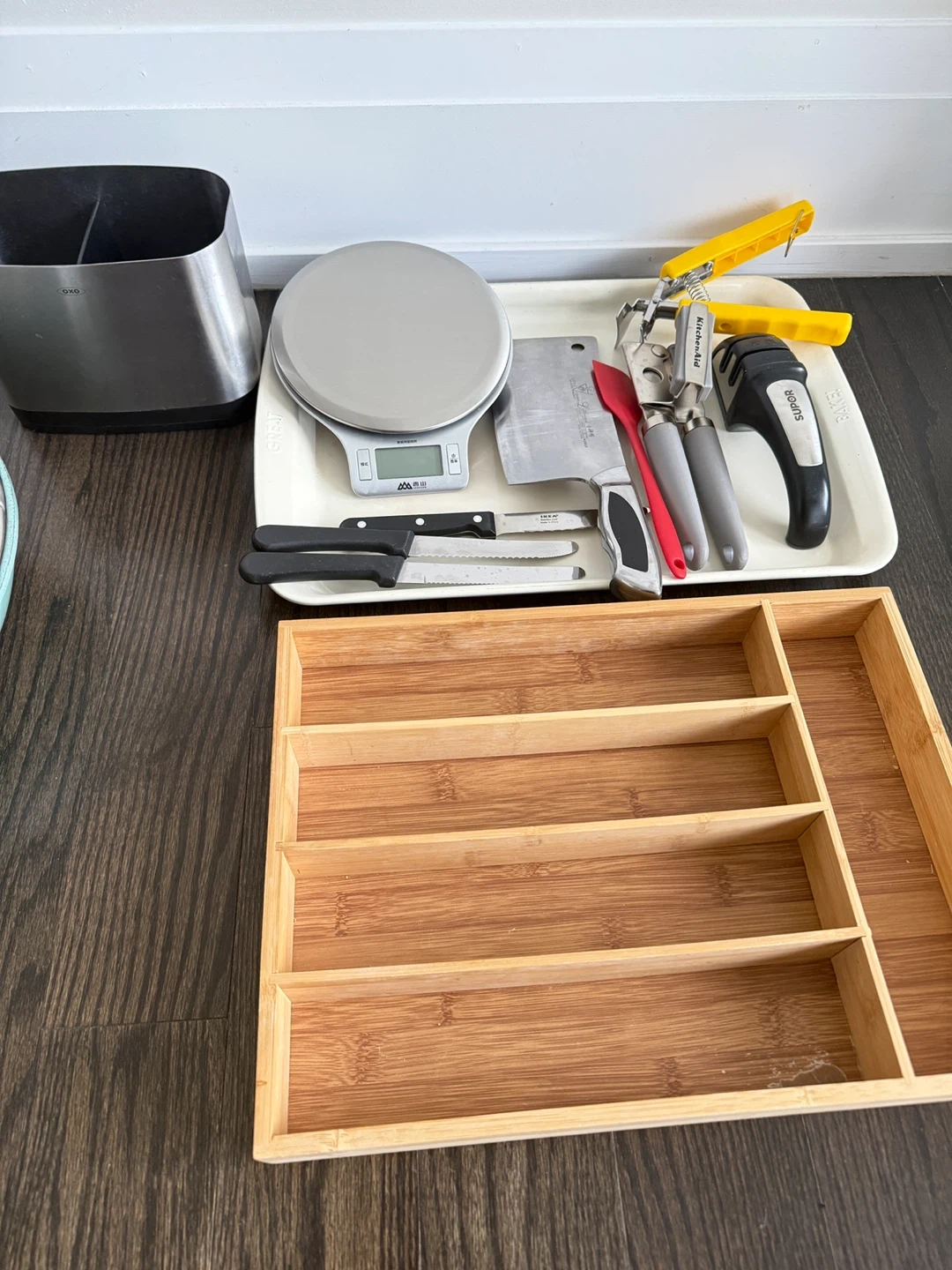This lot includes various kitchen items. It features a digital kitchen scale, a large chef's knife, a bread knife, a spatula, a can opener, and a utensil holder. Also included is a bamboo cutlery organizer. Can be sold separately or as a bundle please DM for price.