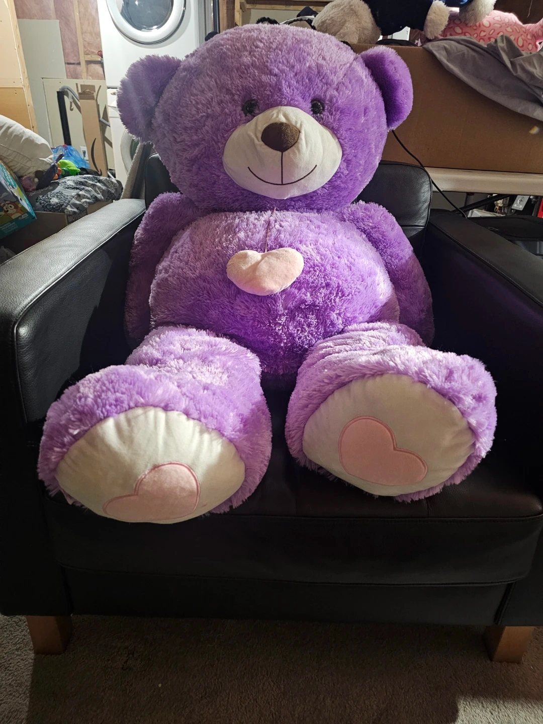 A big, cuddly purple teddy bear with a pink heart on its chest. It has soft, plush fur and a friendly embroidered face. This bear is perfect for hugs and would make a great gift!