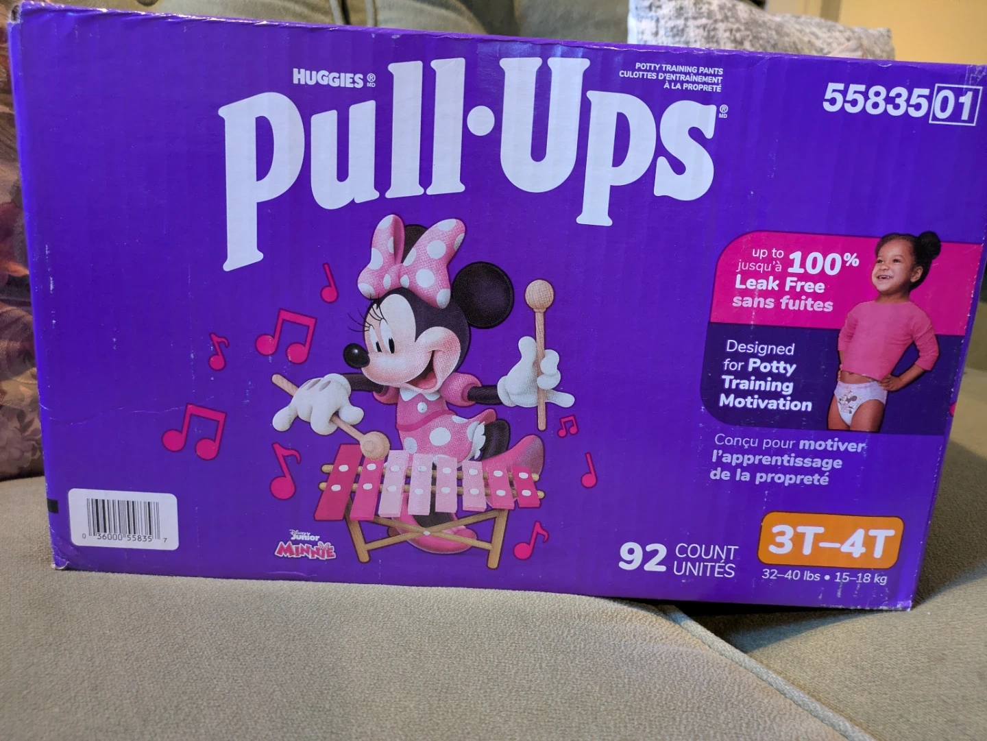 Huggies Pull-Ups training pants for girls featuring Minnie Mouse. Designed for potty training motivation, they offer up to 100% leak-free protection. Size is 3T-4T, suitable for 32-40 lbs. Contains 92 count.