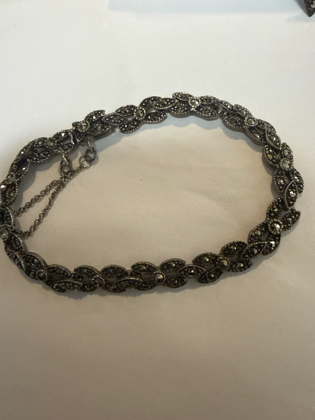 Beautiful vintage bracelet with intricate marcasite detailing. It's a delicate piece with a silver-tone chain and clasp. This bracelet adds a touch of old-world charm to any outfit!