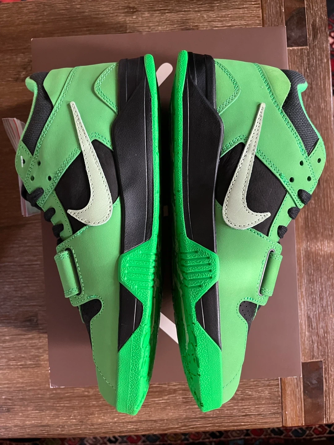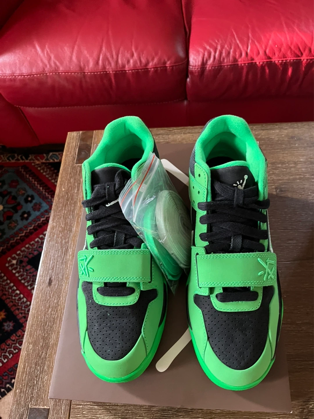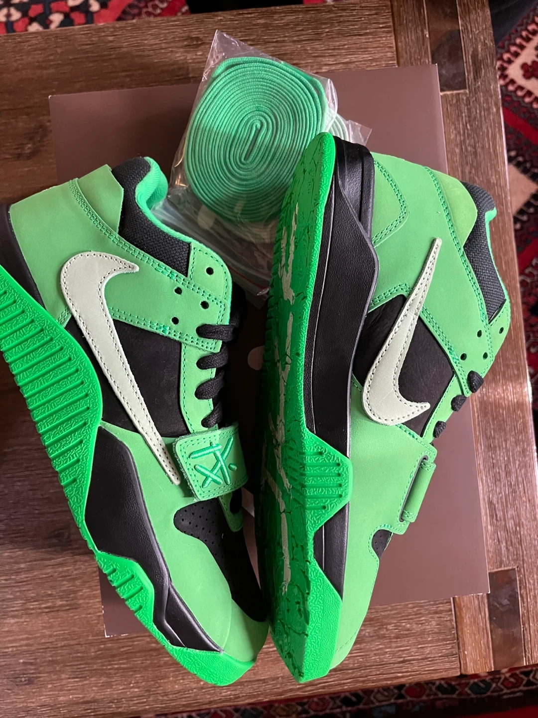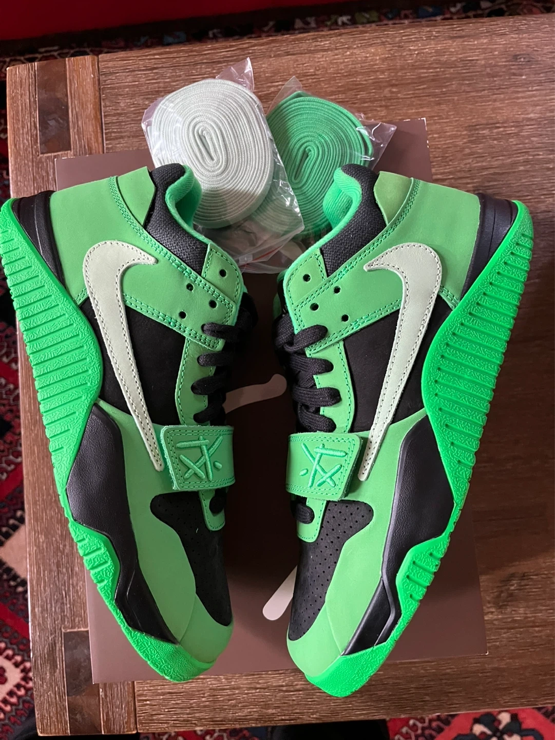 Fresh Jordan Travis Scott Jumpman Jack sneakers. New in box with original tissue paper and extra laces. Comes with both light green and dark green laces. The 'Jack' graphic on the shoes is known to wear off with use over time, just so you know. Super clean, never worn.