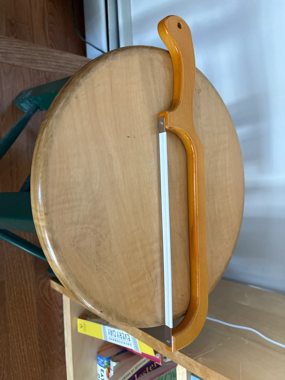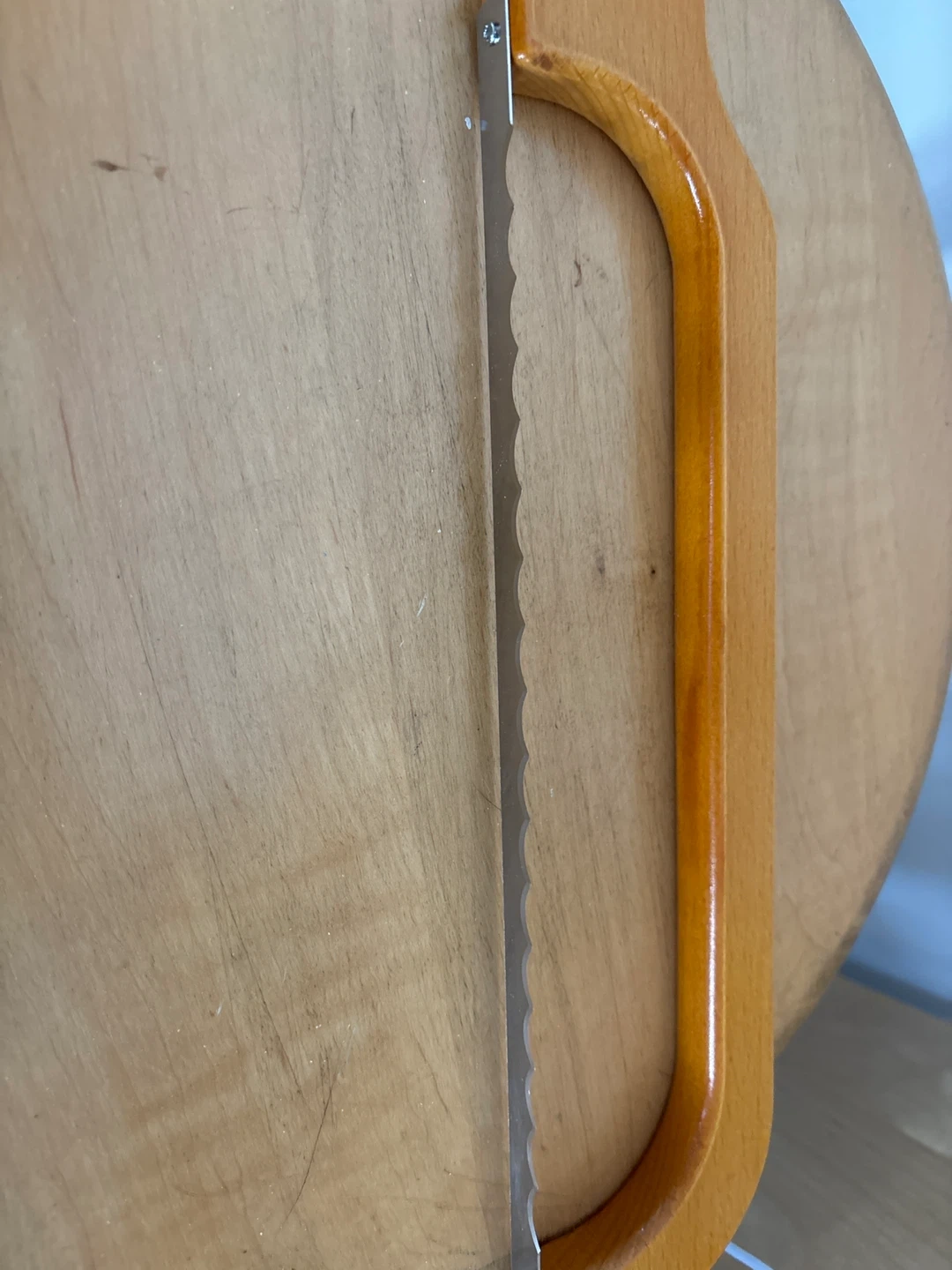 This is The Breadly "Earthly Bliss" bread knife. It features a serrated stainless steel blade and a smooth wooden handle. It's great for slicing loaves of bread evenly and comes with an extra blade. Never used.