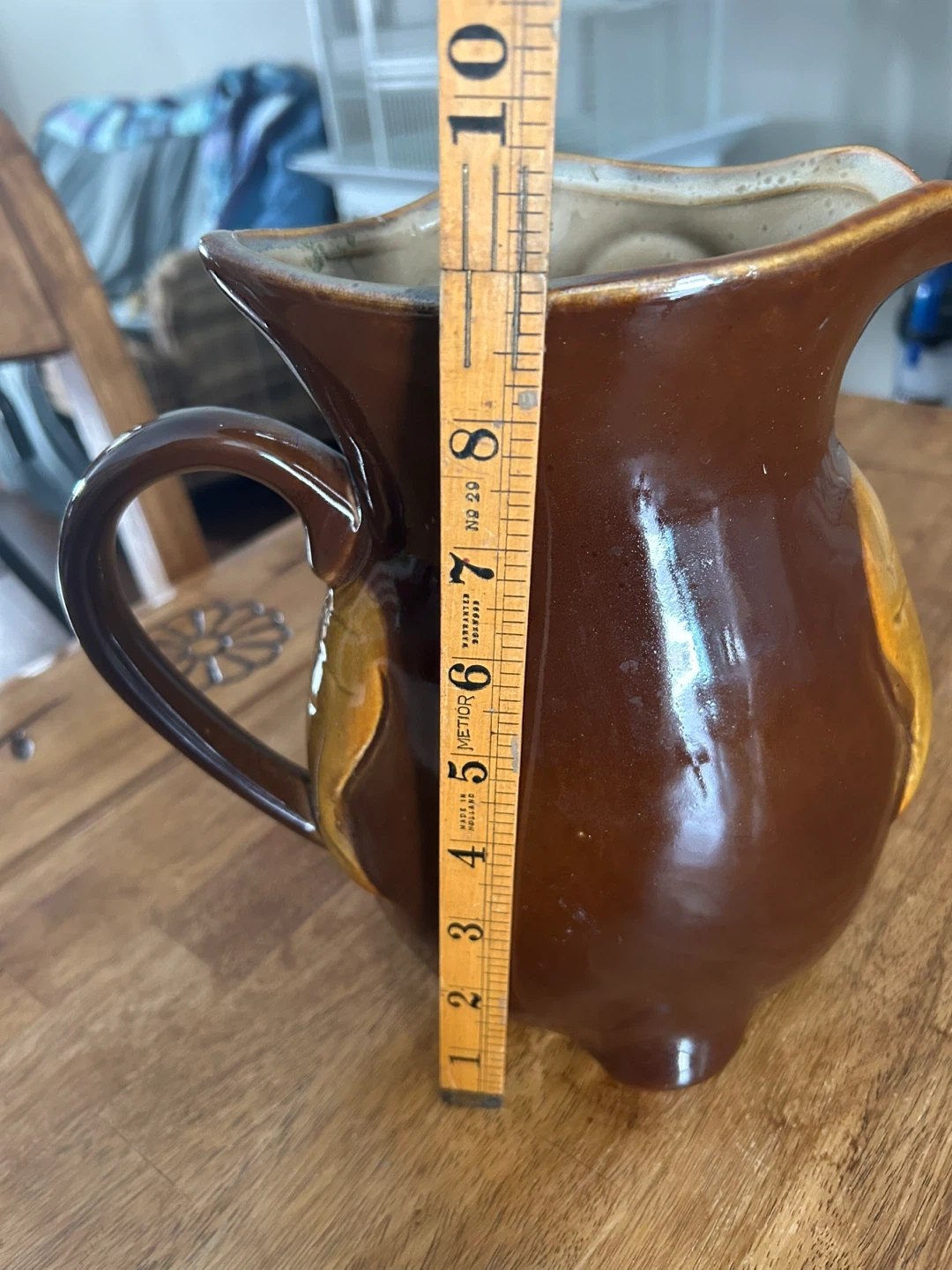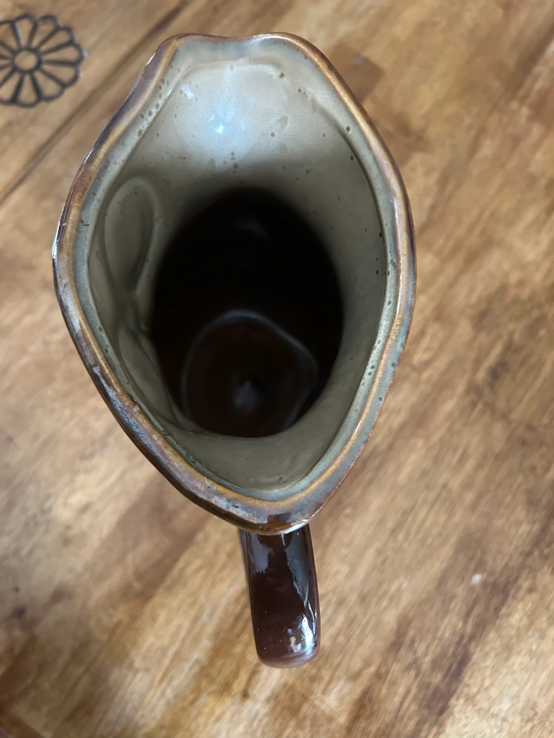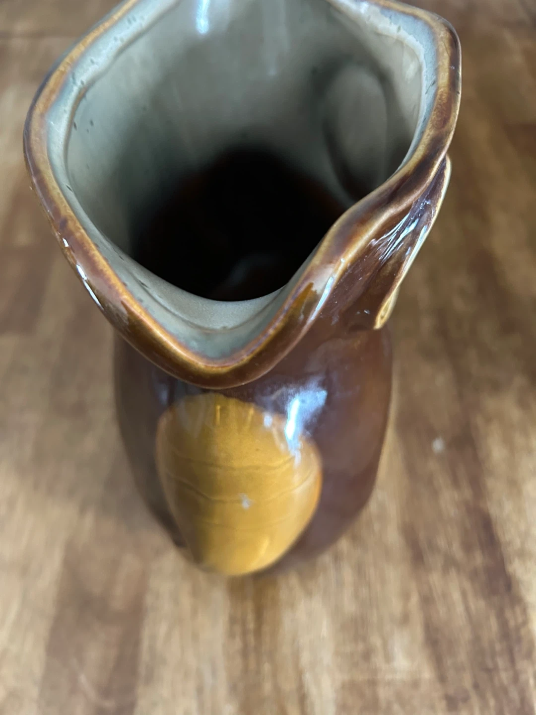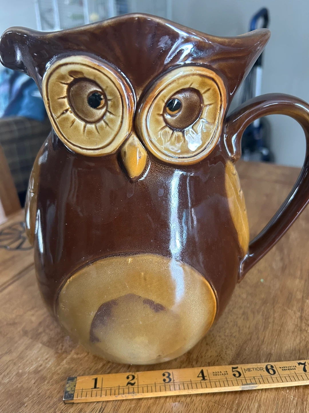 A cute brown owl ceramic pitcher. It's about 8 inches tall. This would be a neat decorative piece for a kitchen or shelf. Ceramic material.