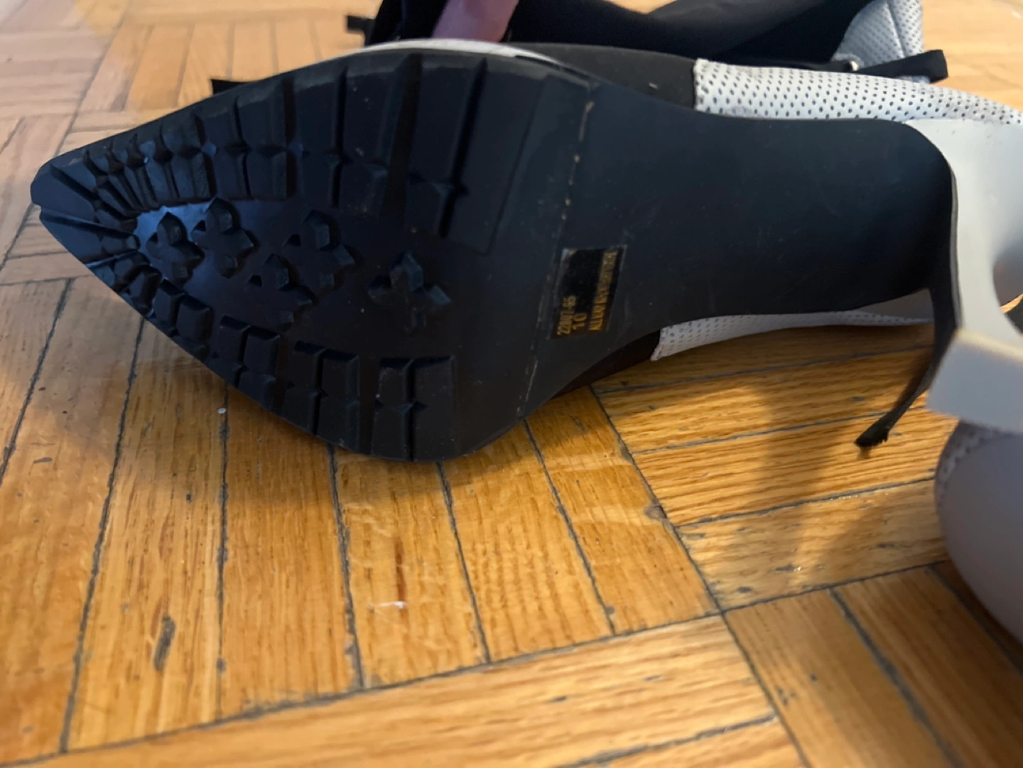 Black and white knee-high boots with a pointed toe and stiletto heel. Lace-up design with a zipper on the inside of the boot.