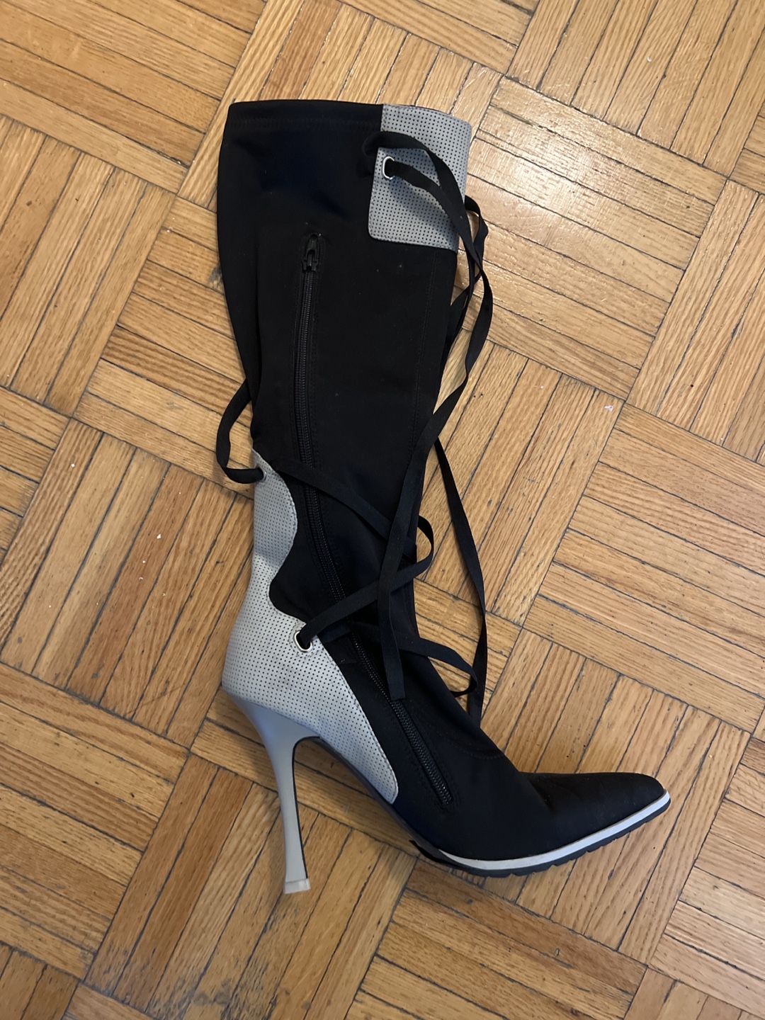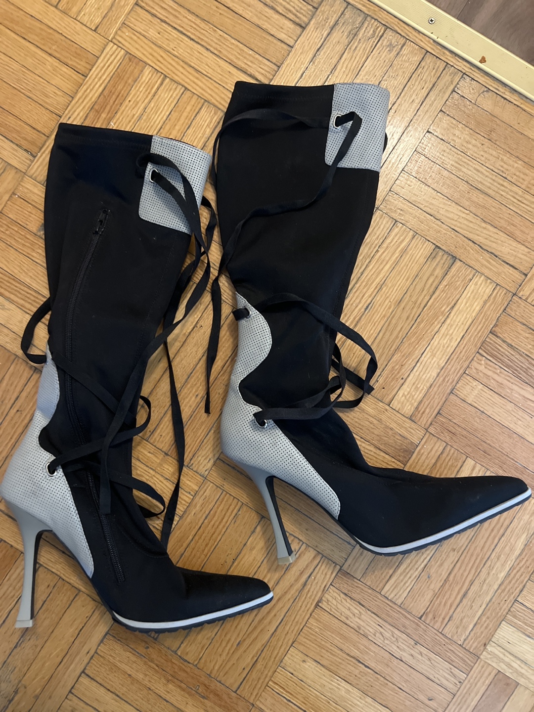 Black and white knee-high boots with a pointed toe and stiletto heel. Lace-up design with a zipper on the inside of the boot.