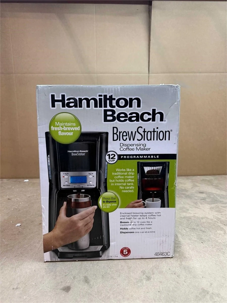 Hamilton Beach BrewStation 12-cup programmable coffee maker. Enclosed brewing system keeps coffee hot for up to 4 hours. No carafe needed, dispenses one cup at a time. Brew strength and keep warm options available.