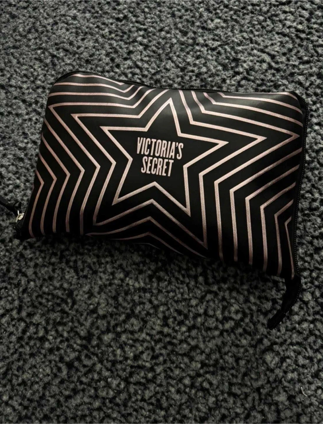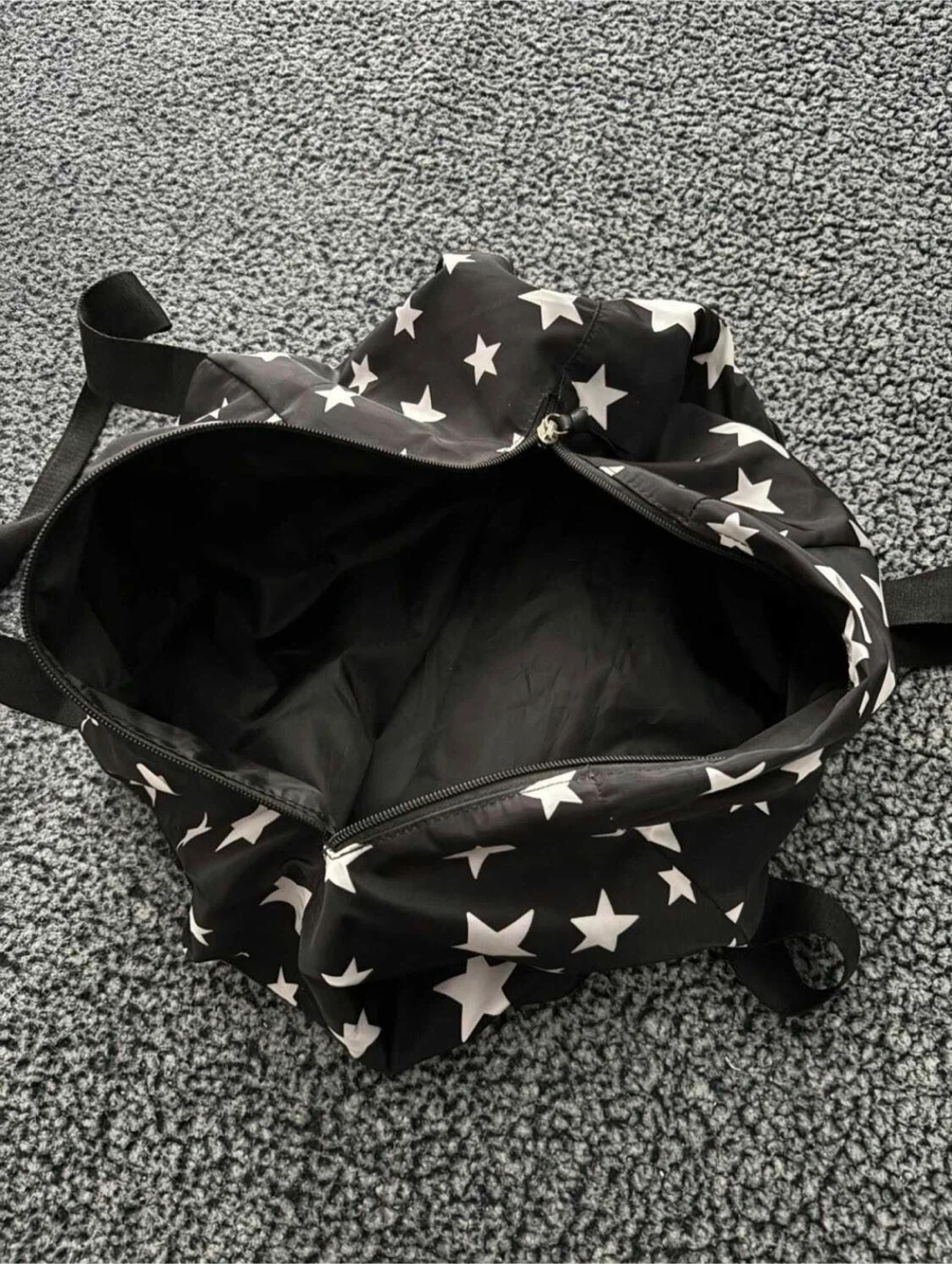This Victoria's Secret duffle bag has a black background with white stars all over. It features two handles and a zipper closure. Perfect for a weekend trip or gym session!