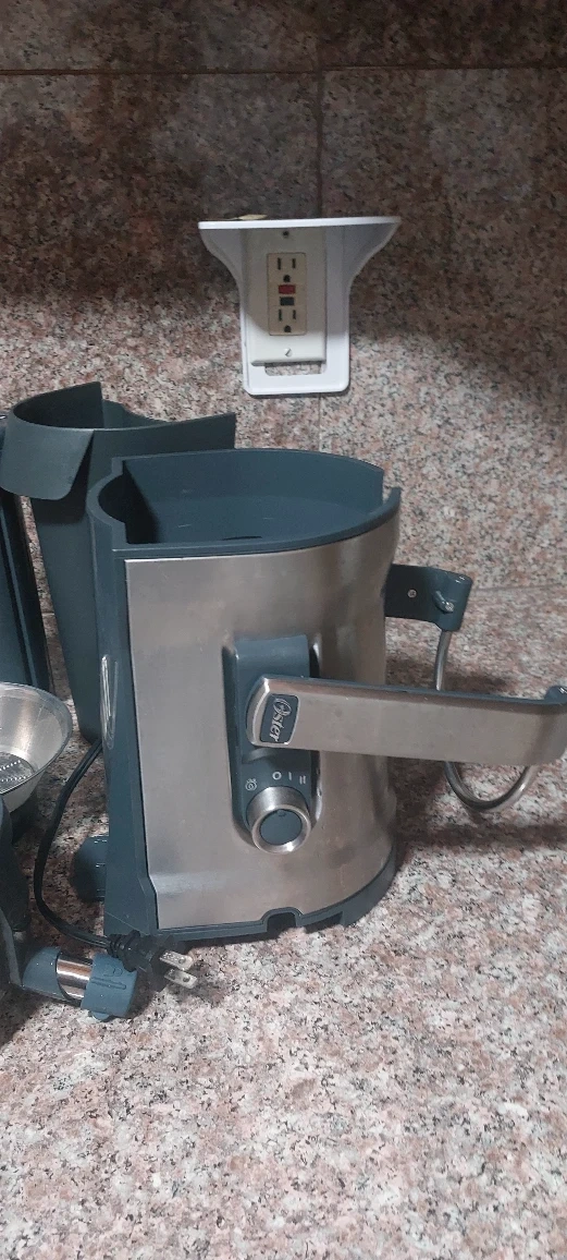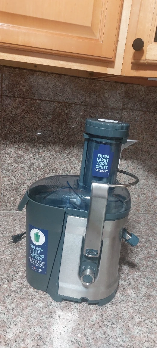This Oster juicer features an extra-large juice chute. It comes with all disassembled parts shown. See how self-cleaning works! Great for making fresh juice at home.
