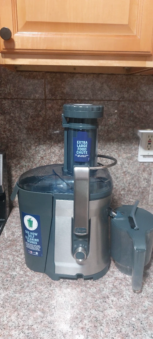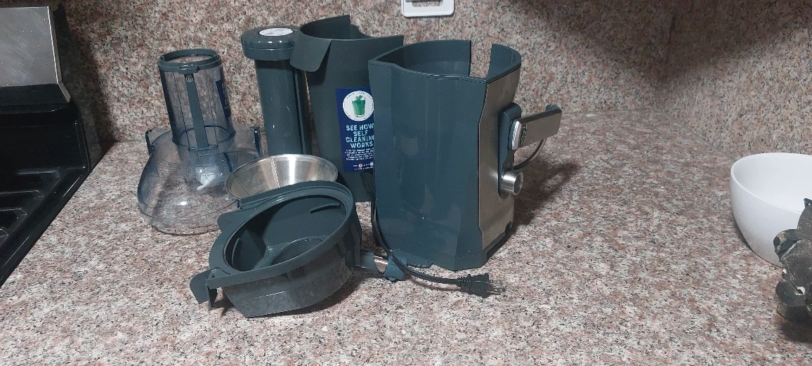 This Oster juicer features an extra-large juice chute. It comes with all disassembled parts shown. See how self-cleaning works! Great for making fresh juice at home.