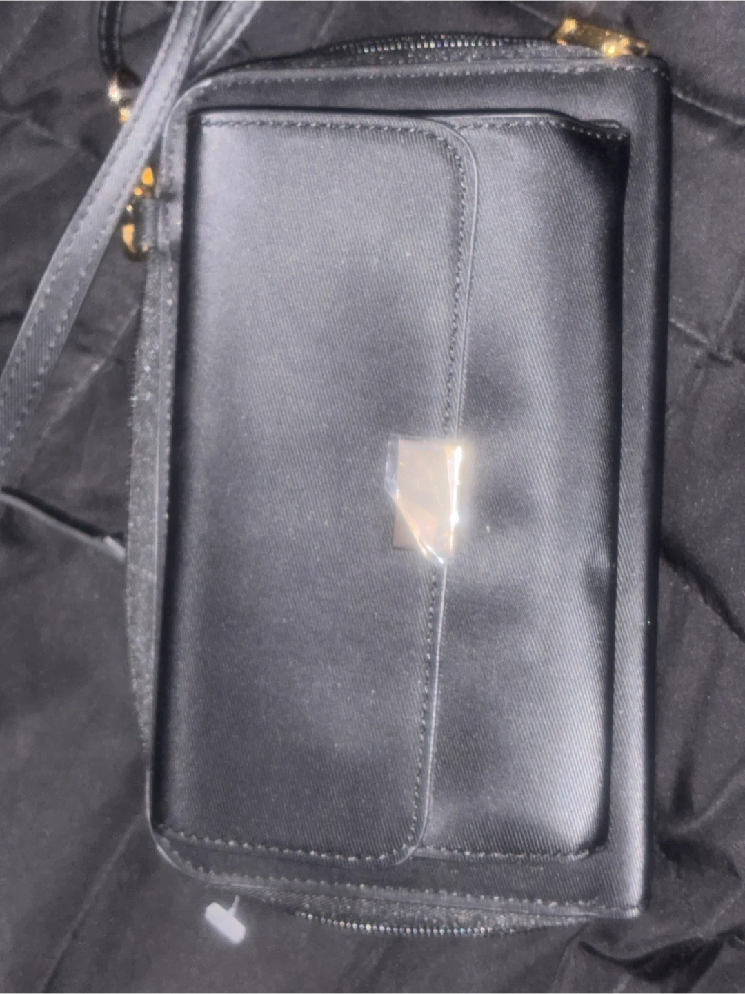 This black clutch wallet features a clear window for easy access to your ID or phone. It has multiple zippered compartments for organizing your essentials. The wrist strap makes it easy to carry.
