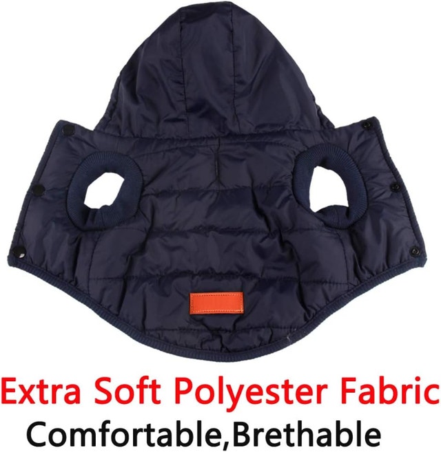 Extra warm dog hoodie with fleece lining and polyester filler, perfect for cold winter weather. Soft and comfortable polyester fabric. Protects your dog's ears and head from the cold. Lightweight, durable, and breathable with exquisite sewing. Features a leash hole at the neck. Easy to put on and take off with snaps. Elastic edges at the waist and leg openings. Size L: Chest 17.1"-20", Neck 14.6", Length 14.6". Best for medium dogs. Please measure your dog and refer to the size chart, prioritizing chest girth. If between sizes, we suggest selecting the larger size.