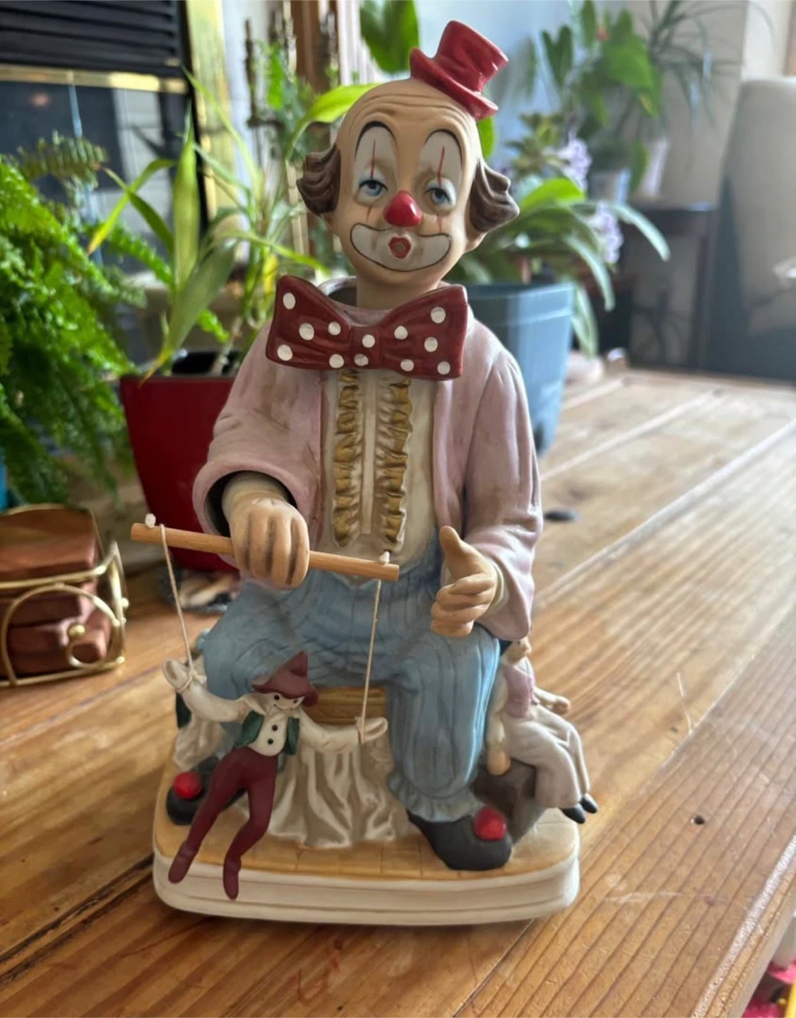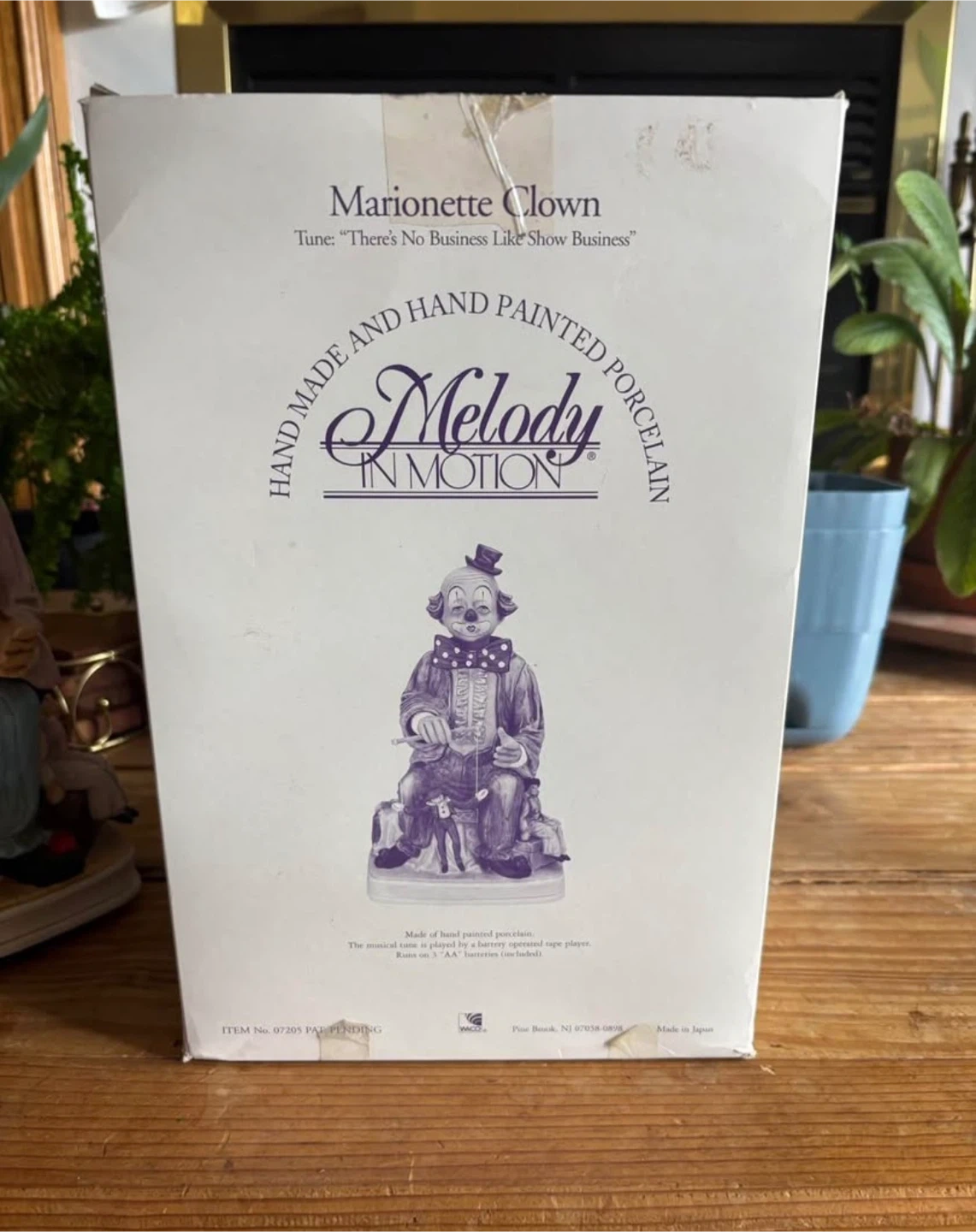 Hand-painted porcelain marionette clown figurine by Melody in Motion. It plays the tune "There's No Business Like Show Business." This item is made of hand-painted porcelain and is imported from Japan.