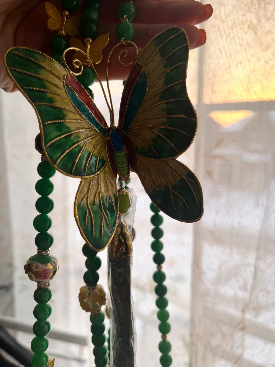 China ICH. Beautiful decorative butterfly charm with intricate enamel work and green jade-like beaded tassels. It's a lovely accent piece. This charm adds a touch of elegance to any setting.