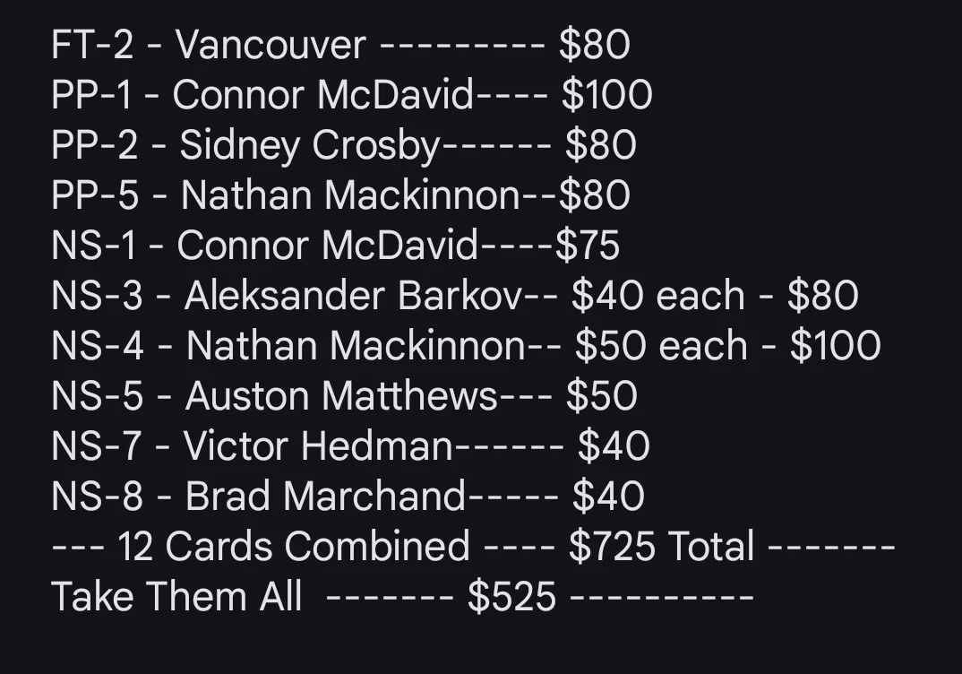 Selling a collection of hockey cards featuring stars like Connor McDavid, Sidney Crosby, Nathan MacKinnon, and Auston Matthews! There are 12 cards in total. Take them all for $525!...i do have costars and other inserts for sale....feel free to check out my fb as they are posted... π Happy Hunting π