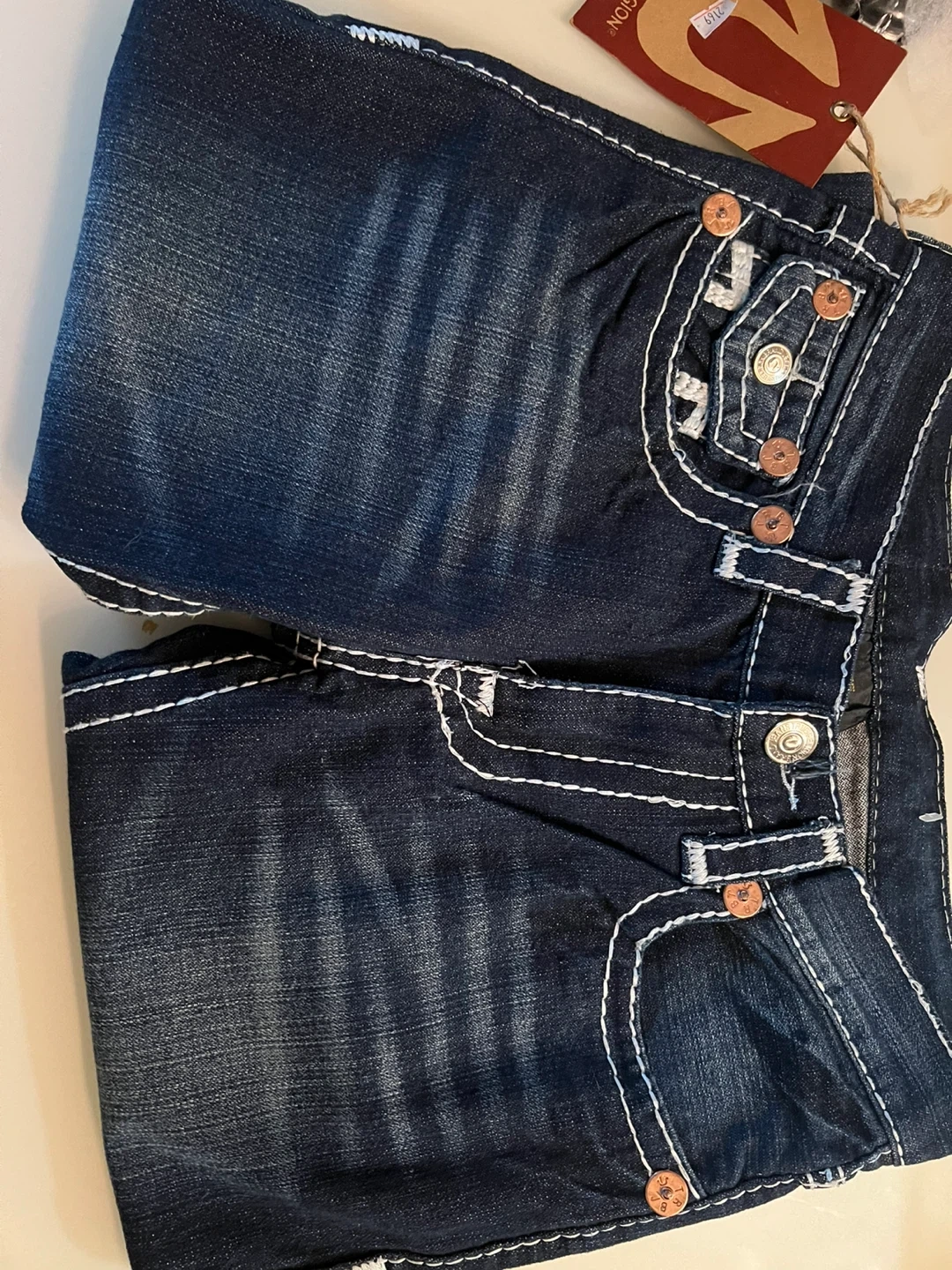 True Religion Joey Super T jeans. Features white contrast stitching and signature horseshoe detailing. Made from durable denim. Brand new never worn.