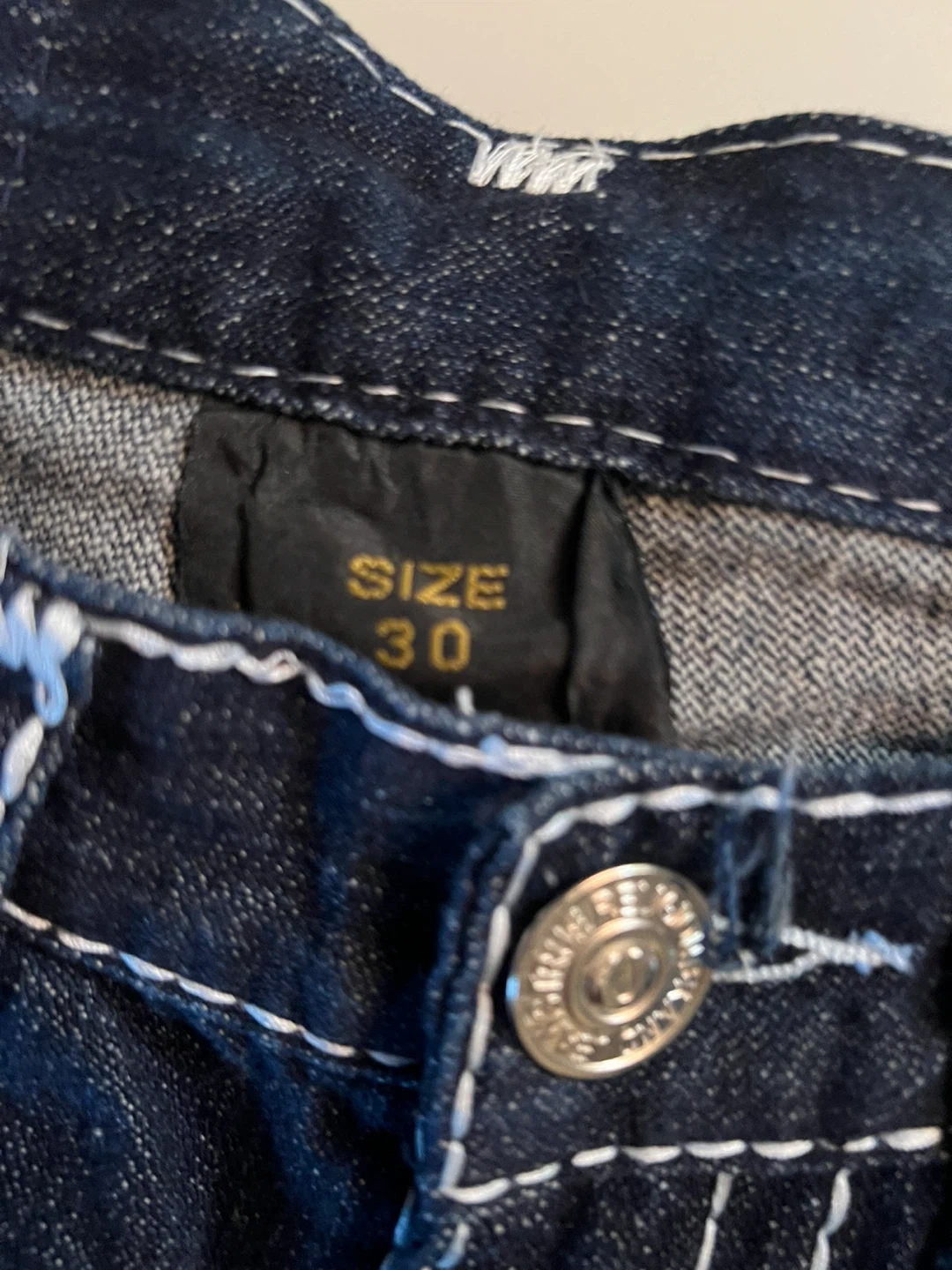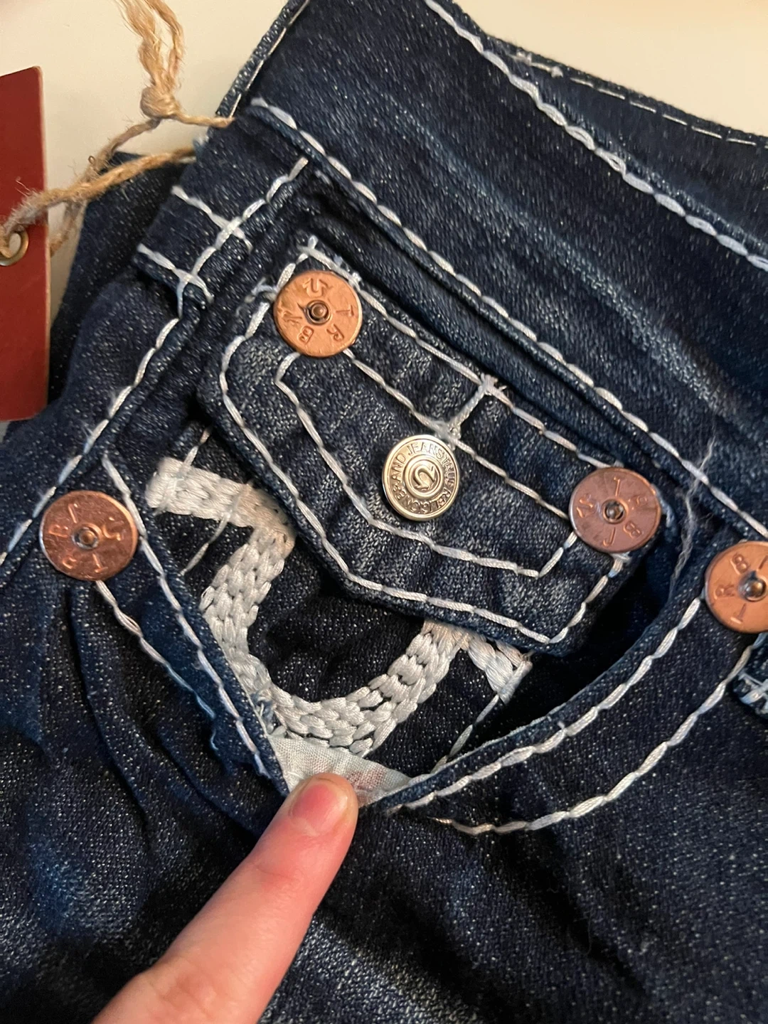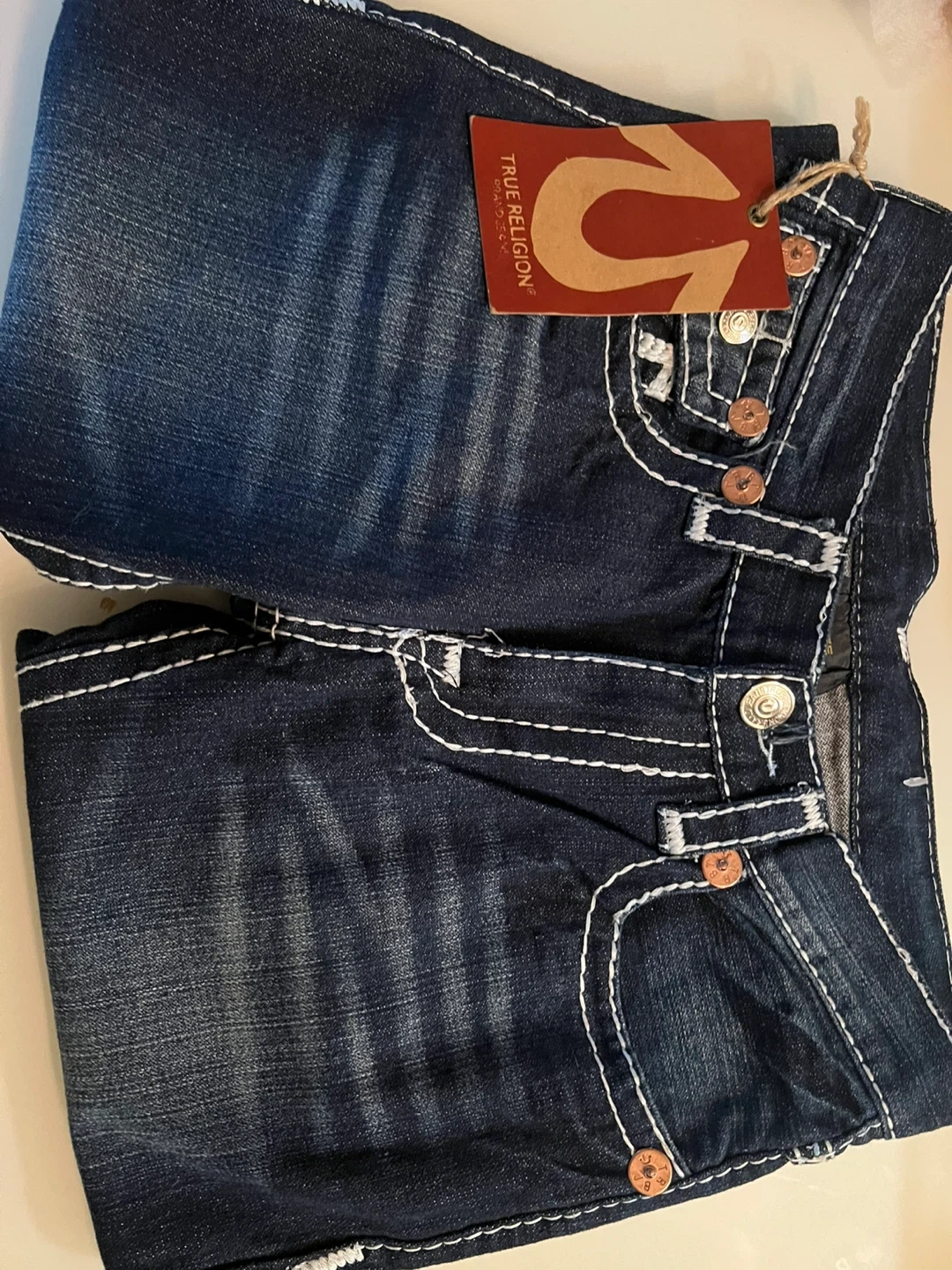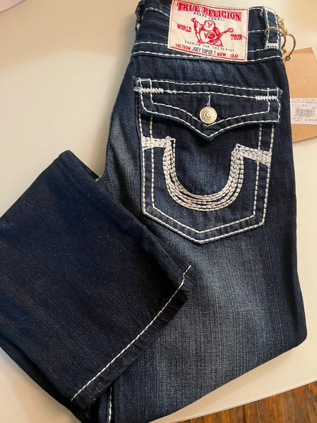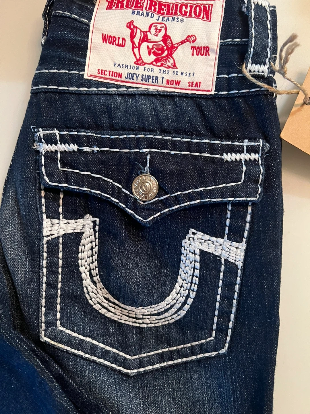 True Religion Joey Super T jeans. Features white contrast stitching and signature horseshoe detailing. Made from durable denim. Brand new never worn.
