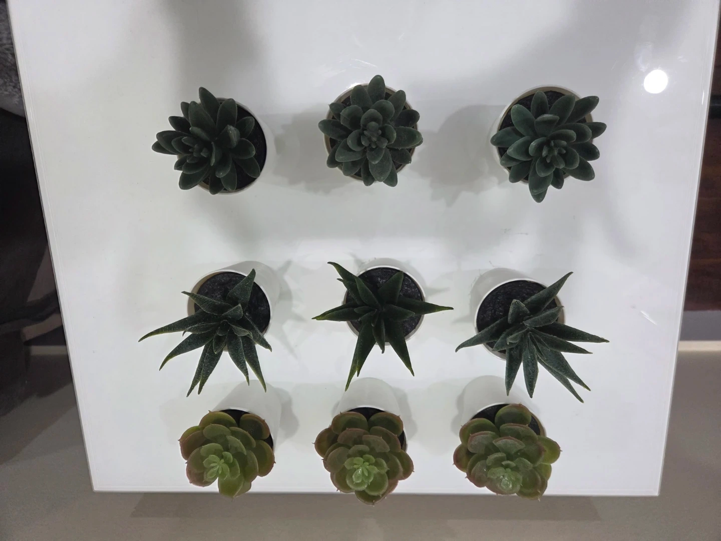 Add a touch of greenery to your space with this set of nine artificial succulents. They come in simple white pots, perfect for any decor. These low-maintenance plants are a great way to bring nature indoors without the fuss!