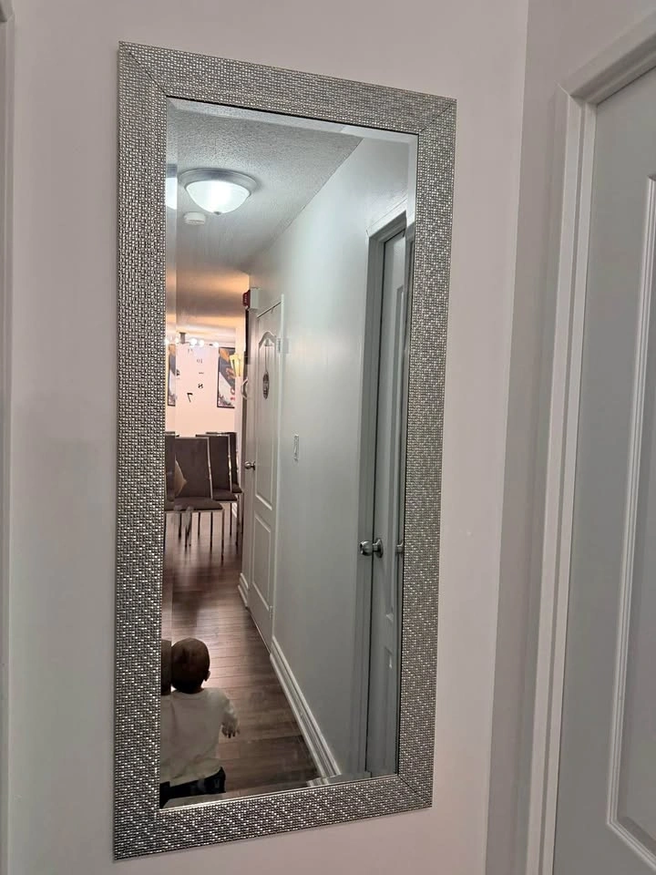 Excellent condition dressing mirror! Dimensions: 23 inches by 53 inches. Elegant wall mirror with a wide silver frame, textured shimmering finish, and beveled glass edge. Sturdy construction with a modern aesthetic.