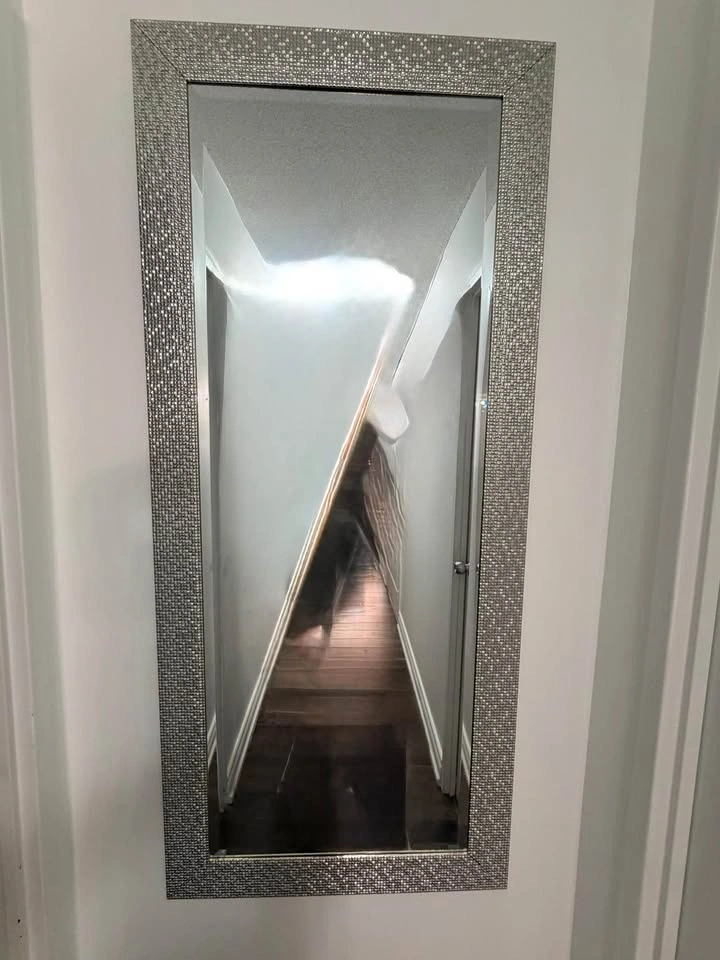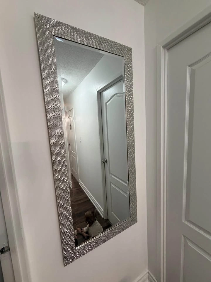 Excellent condition dressing mirror! Dimensions: 23 inches by 53 inches. Elegant wall mirror with a wide silver frame, textured shimmering finish, and beveled glass edge. Sturdy construction with a modern aesthetic.