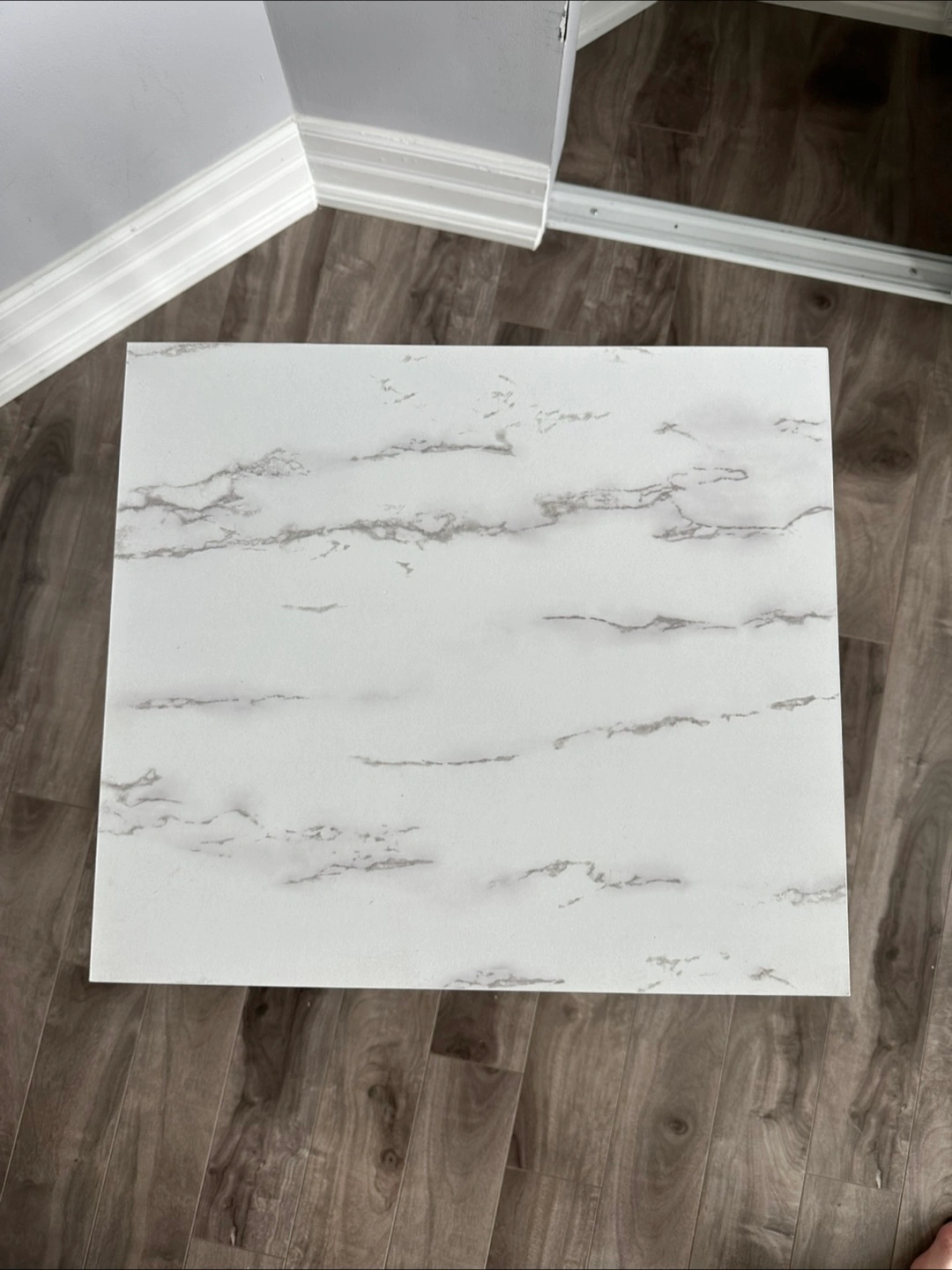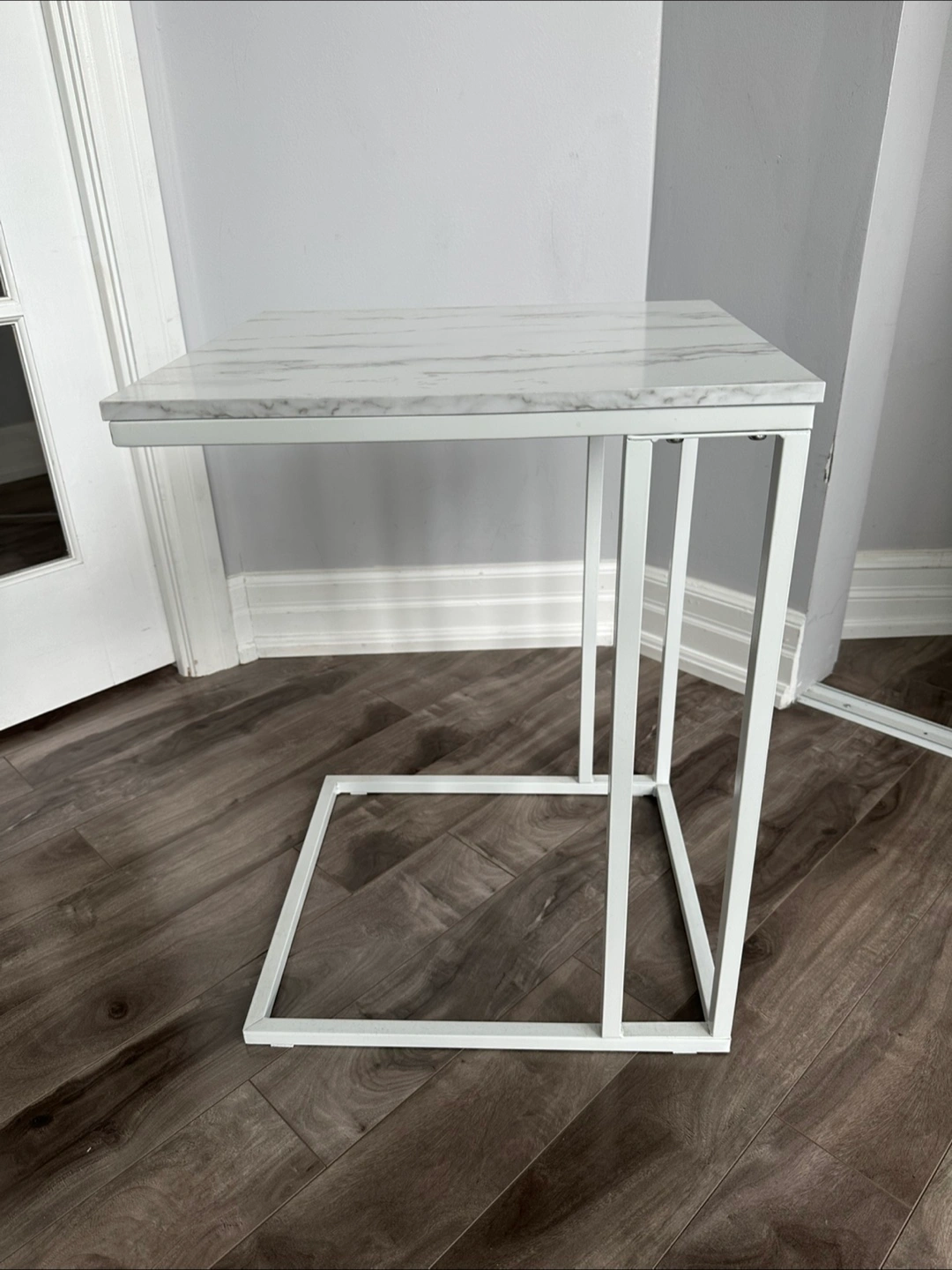 A charming, modern accent table. Featuring a white metal frame with a marble-look tabletop. This table is a good place to put your favourite cup of tea. That AI generated description is so extra.