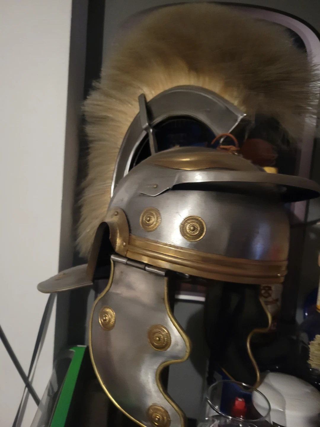 This is a replica Roman Centurion helmet. It's made of metal with brass accents and features a distinctive horsehair plume. It's a great piece for costumes or display!