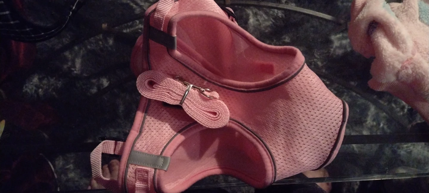 This is a pink mesh dog harness with a leash and a soft pink sweater with colourful polka dots. It's also a black and white checkered harness with red bows. Great for keeping your pup comfy and stylish! Asking $5 each. The tuxedo harness l.am selling 2/$7. These will fit Small animals only.