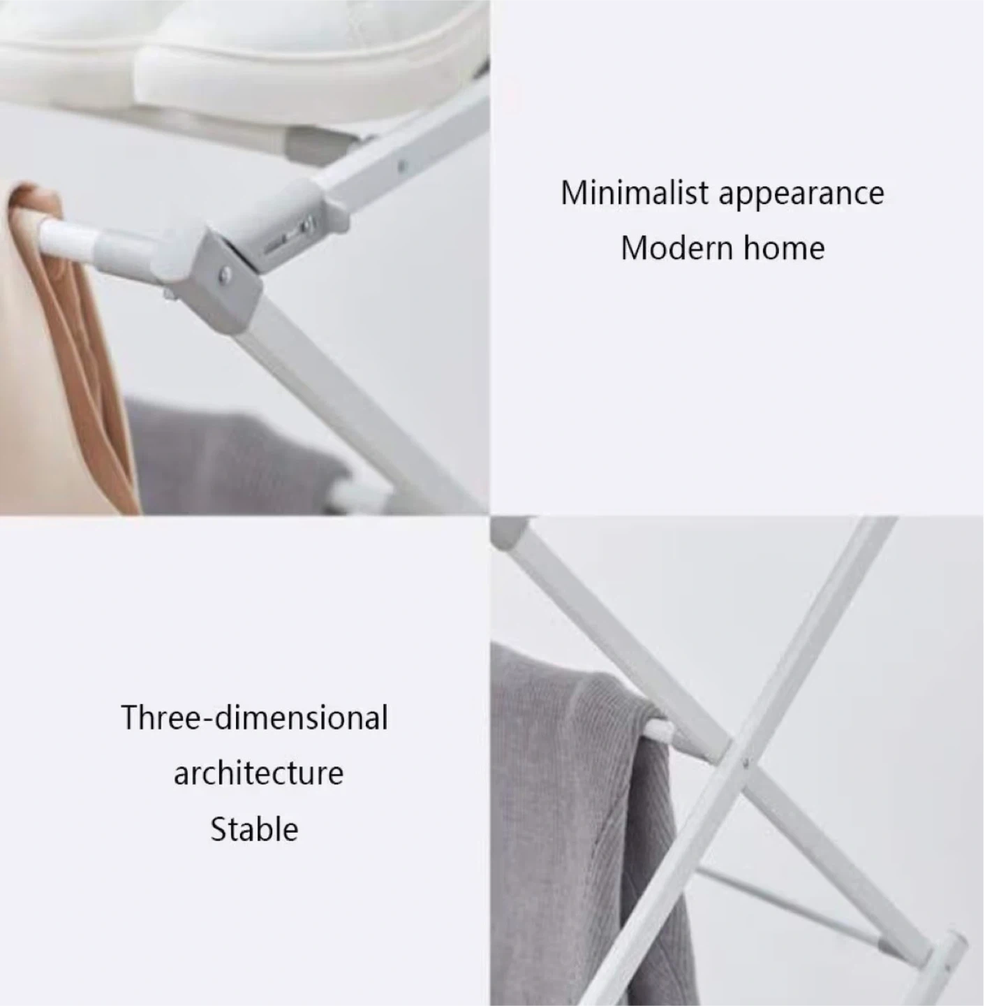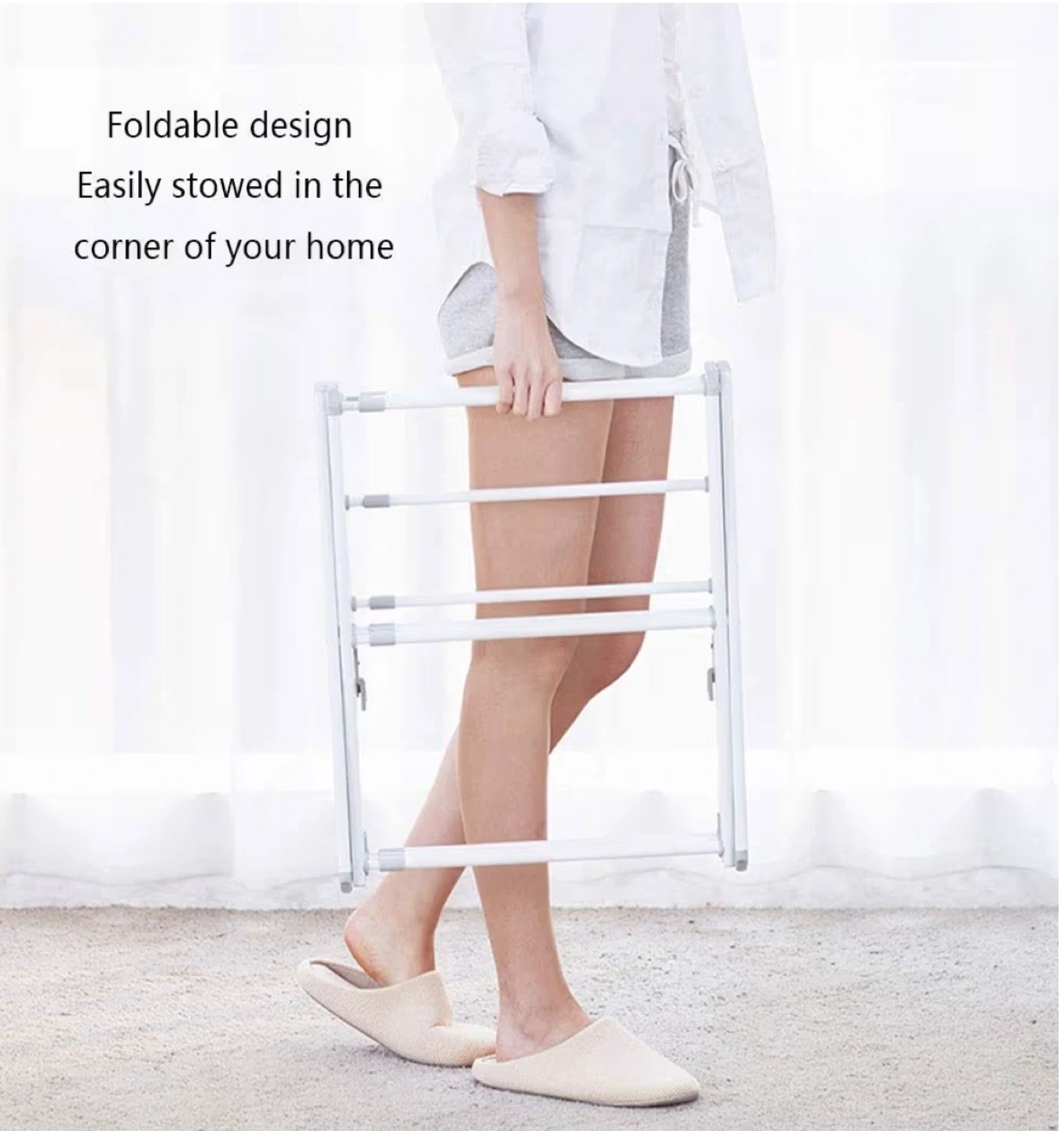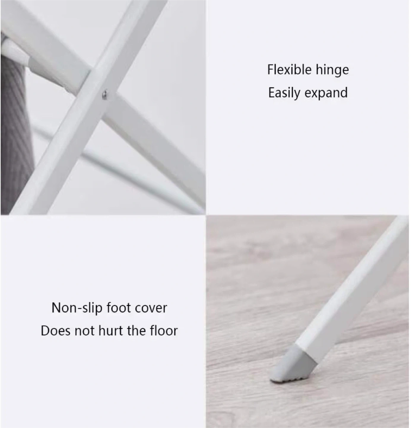 This folding drying rack is simple, neat, and convenient. It features a flexible hinge for easy expansion and non-slip foot covers that protect your floor. It's foldable for easy storage. Dimensions are 75cm x 38cm x 105cm.