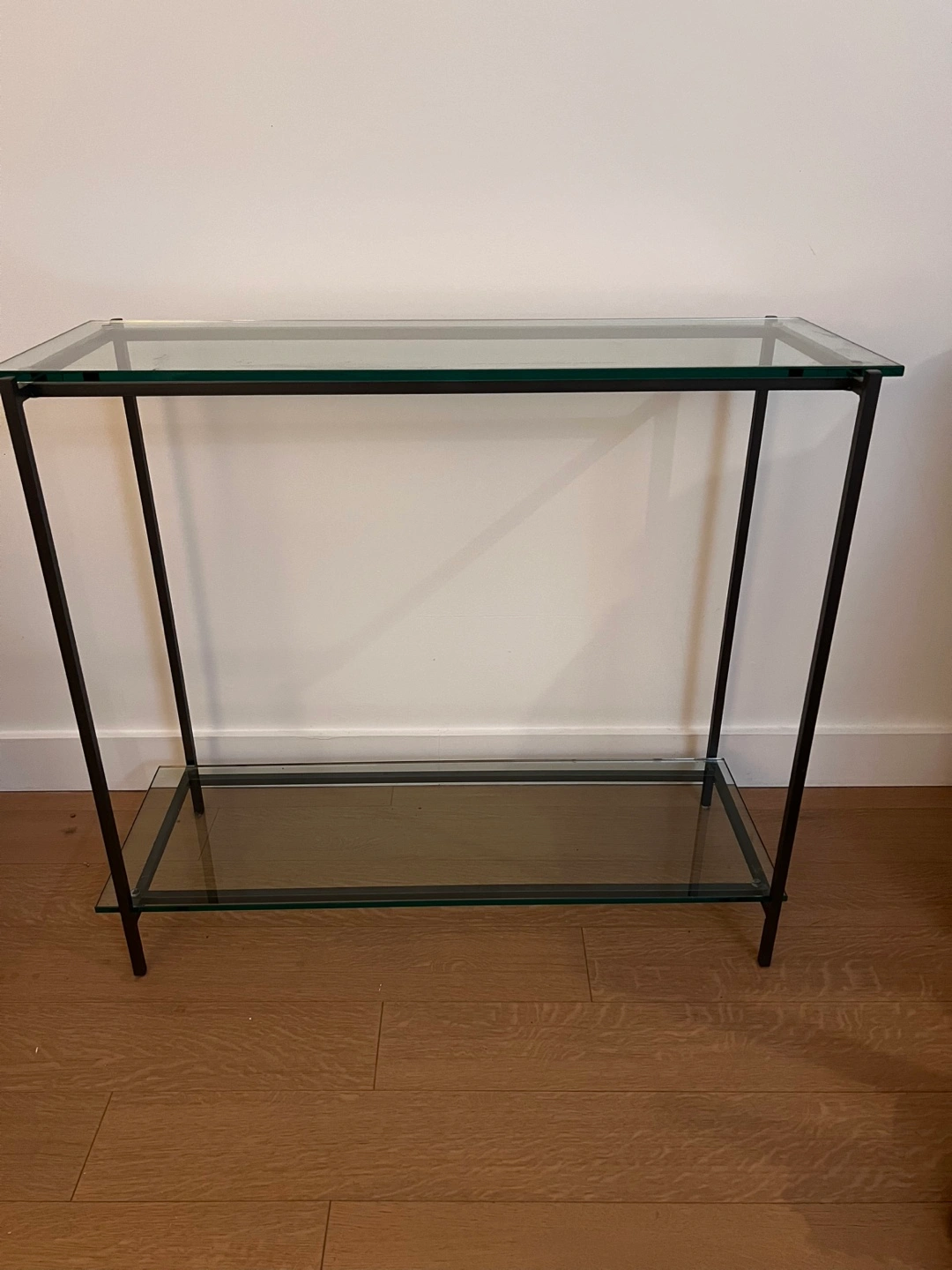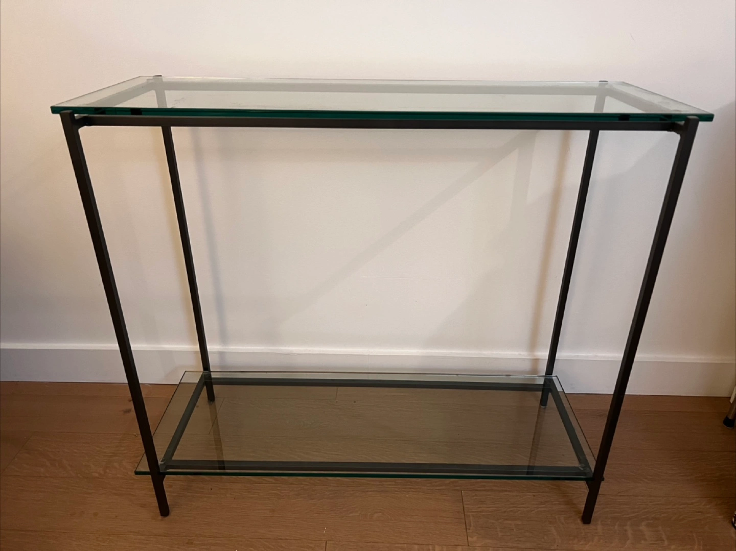 Console table with a dark metal frame. Two clear glass shelves. Perfect for the entryway to put your keys on.