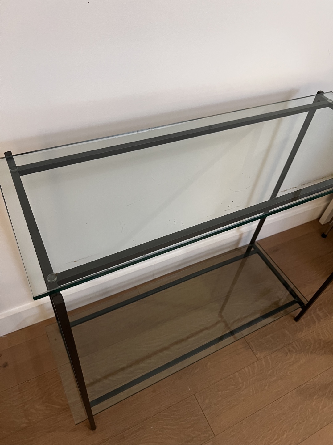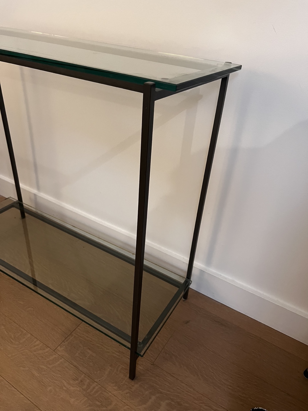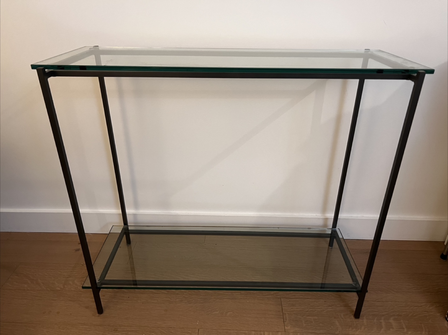 Console table with a dark metal frame. Two clear glass shelves. Perfect for the entryway to put your keys on.