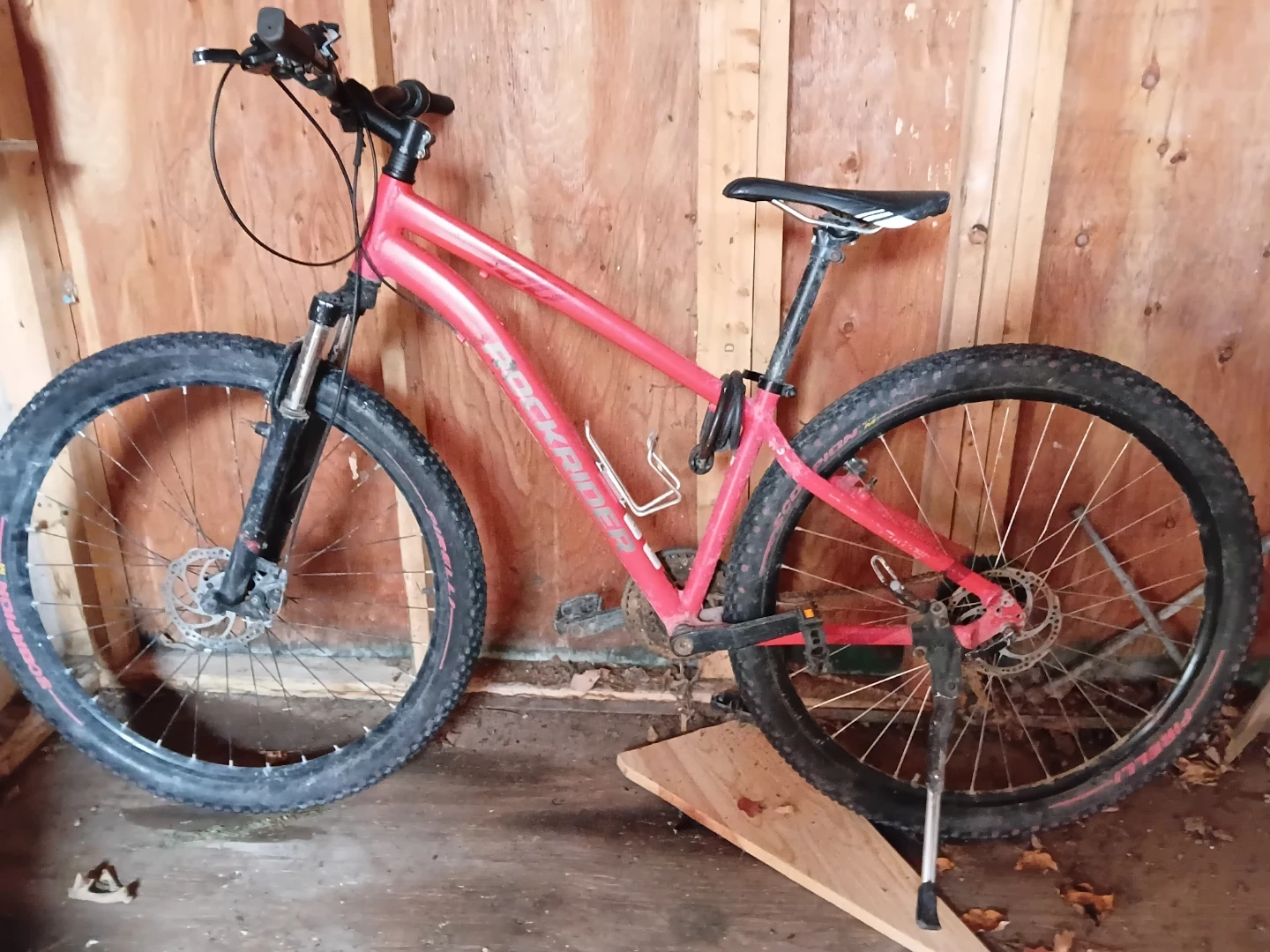 This is a red ROCKRIDER mountain bike with brand new PIRELLI Tires, front & rear disc brakes. It features front suspension, upgraded kickstand, and a water bottle cage. This bike is ready for trails!