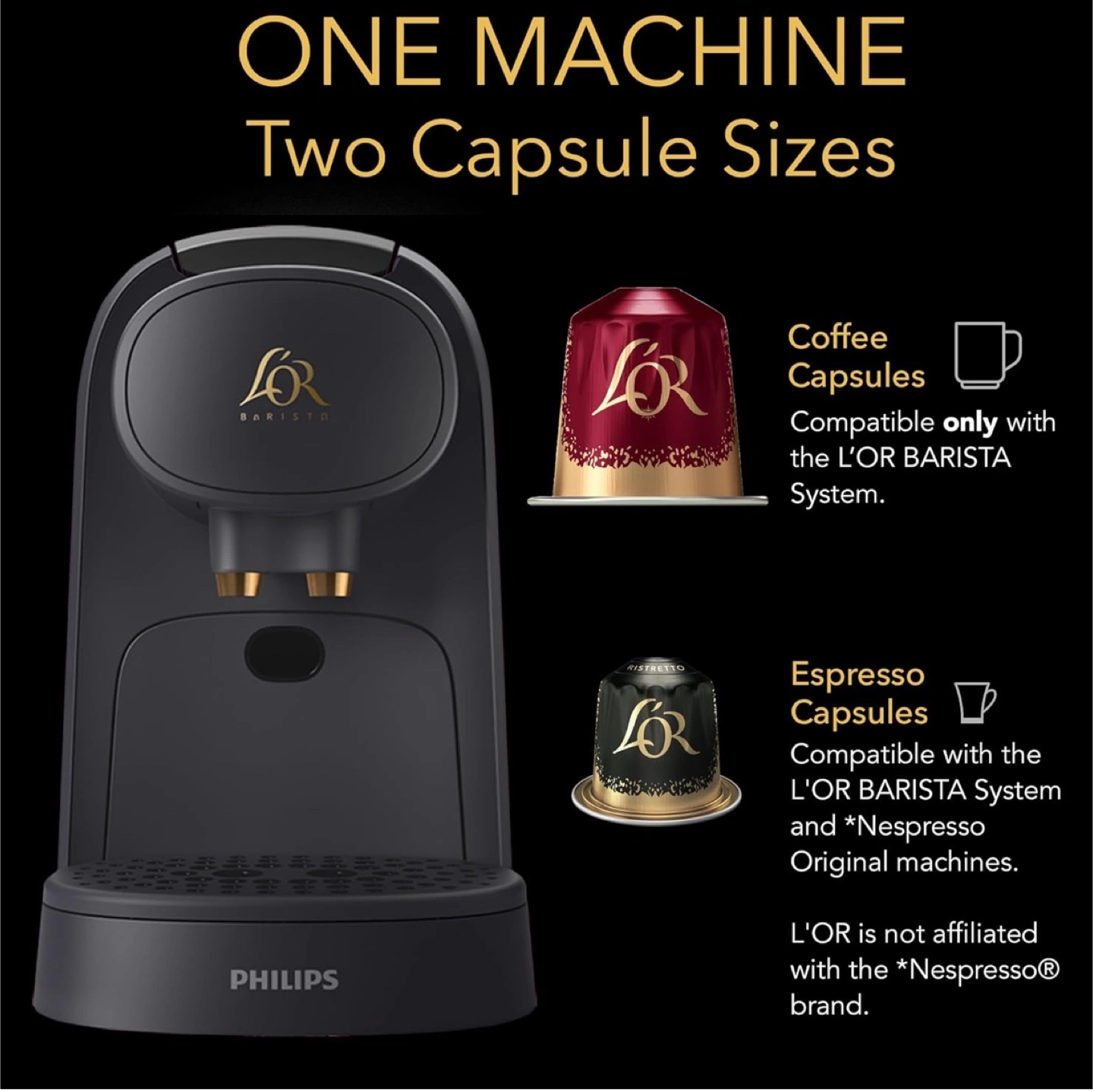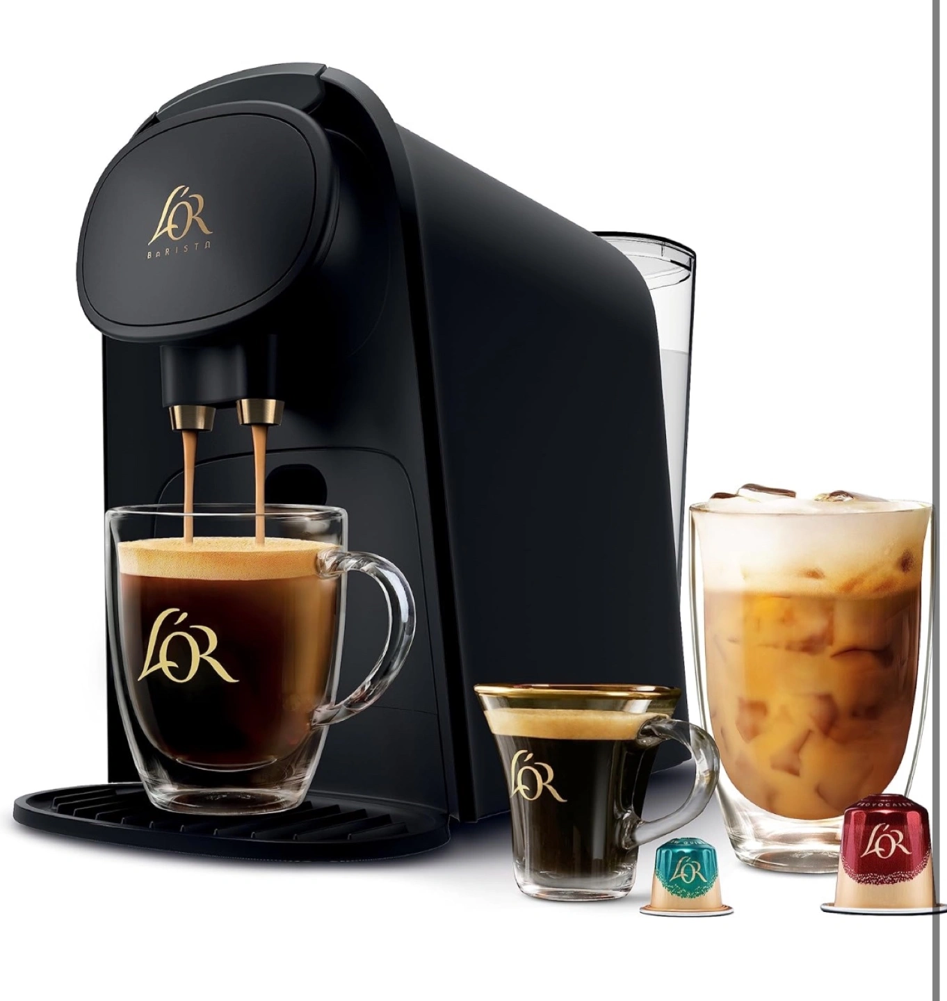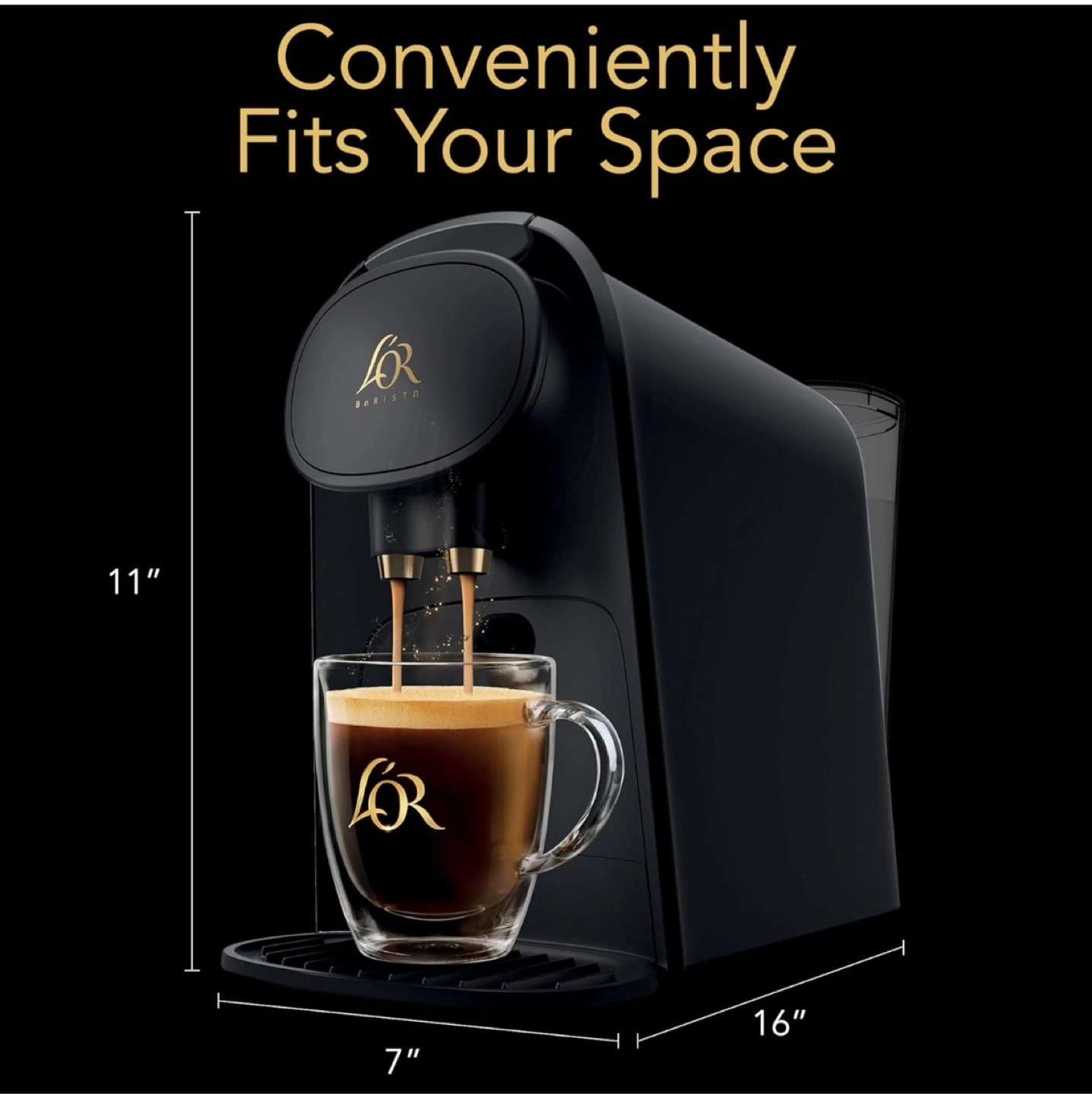 Black coloured coffee machine. Offers small, medium and large coffee options. Compatible with L'OR capsules. With its simple design, this machine would make a great addition to your kitchen in the morning.
