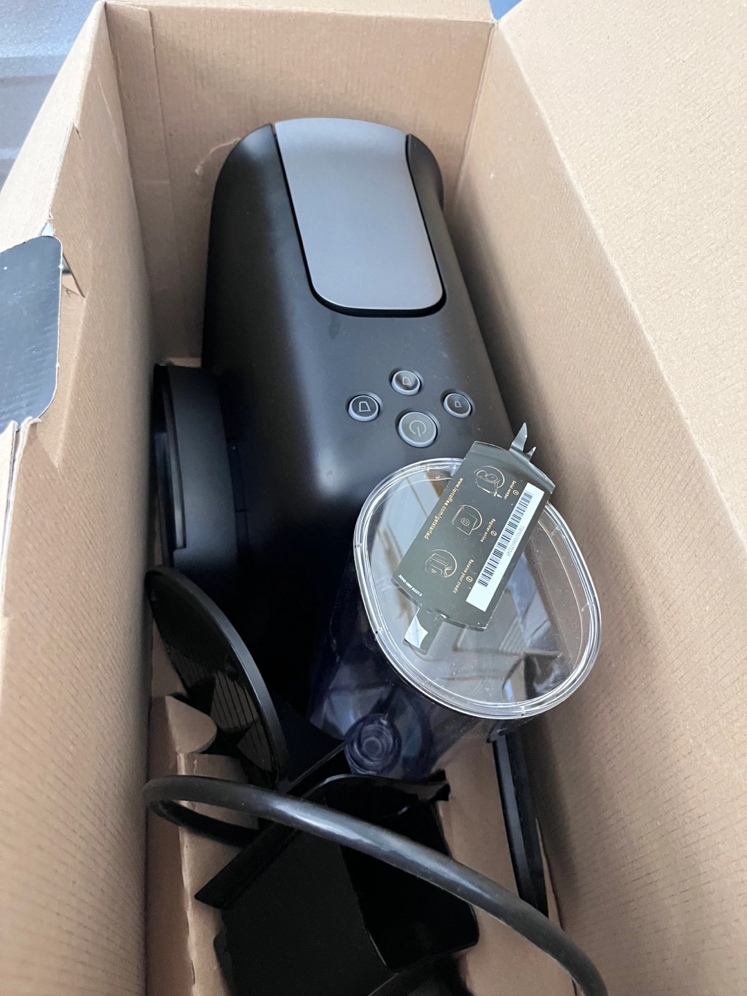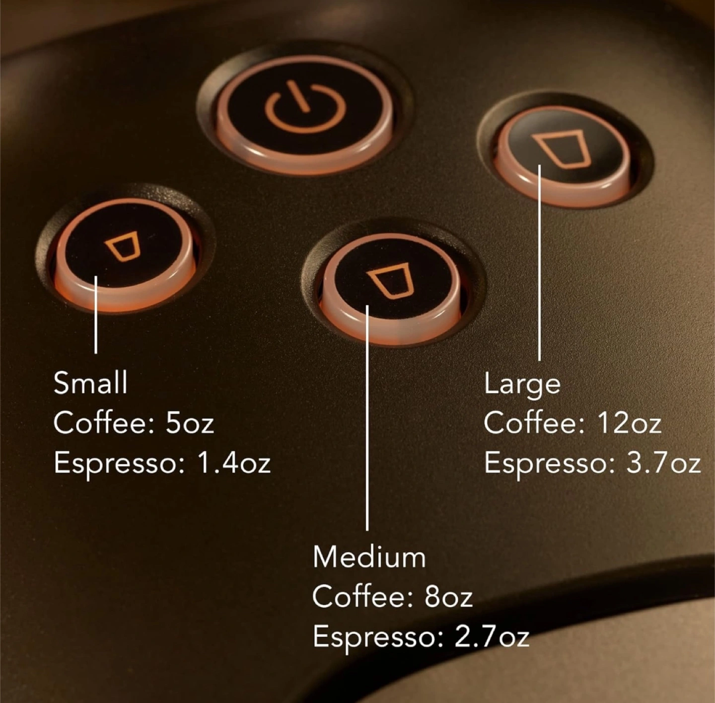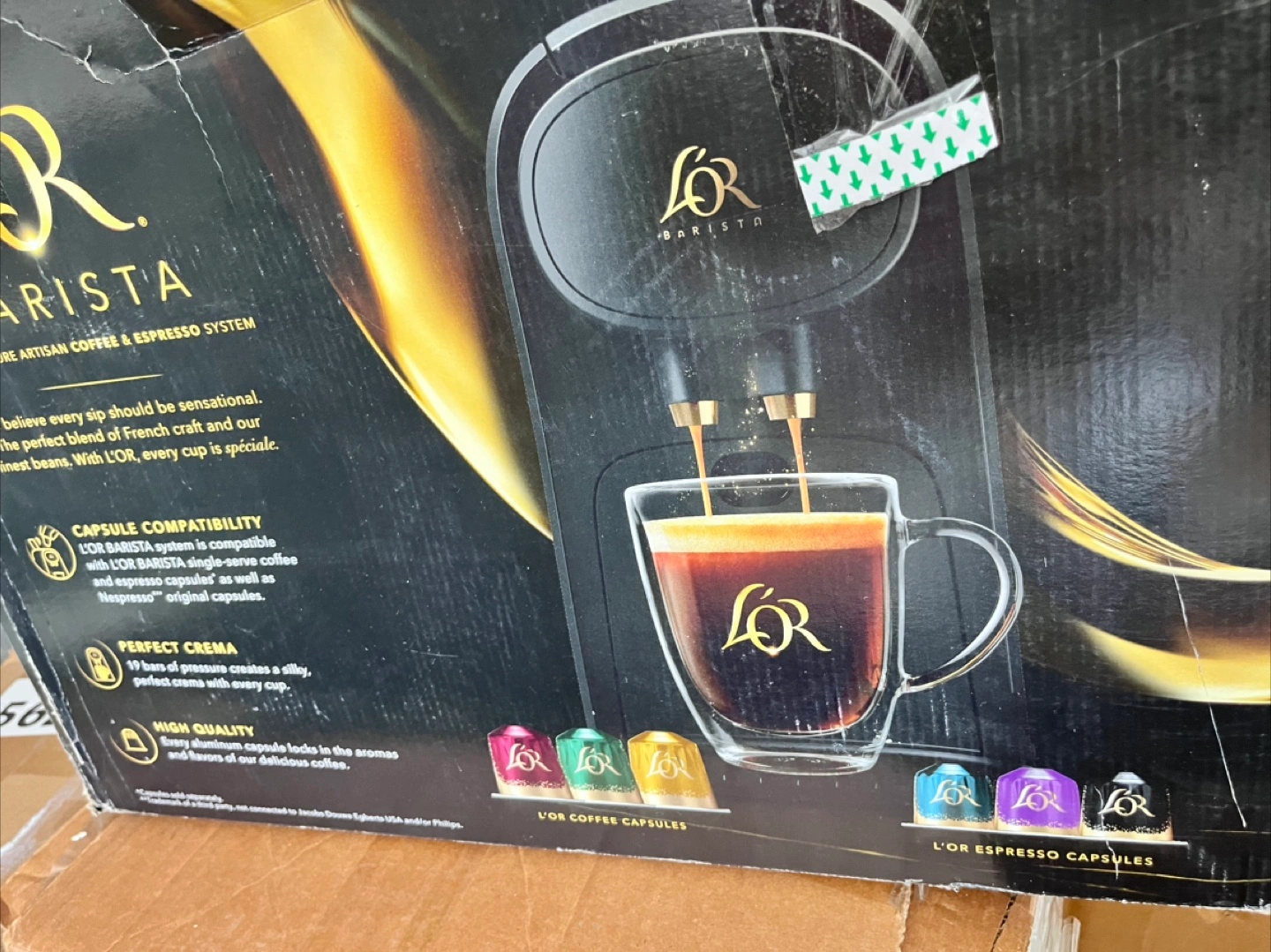 Black coloured coffee machine. Offers small, medium and large coffee options. Compatible with L'OR capsules. With its simple design, this machine would make a great addition to your kitchen in the morning.