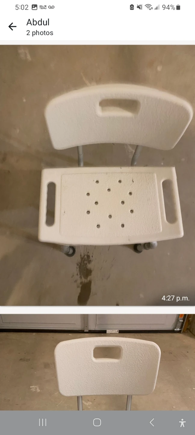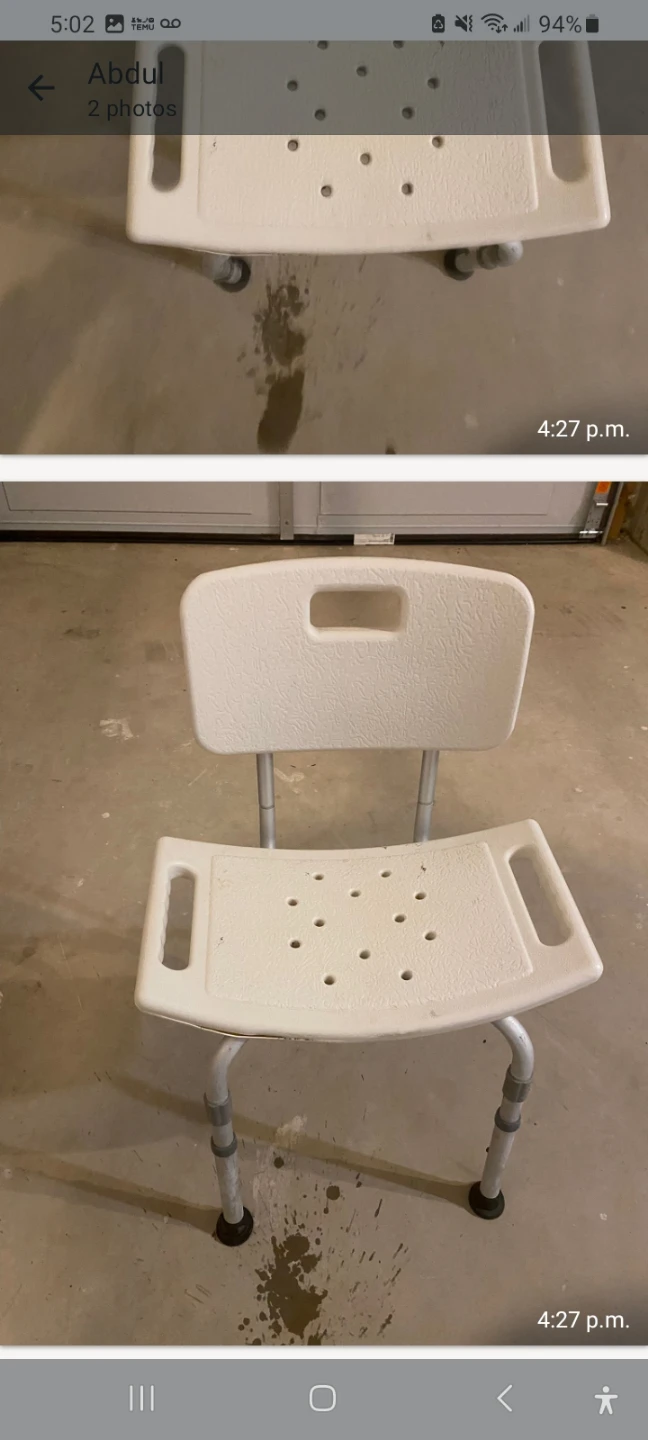 This is a white shower chair with a backrest. It's designed with drainage holes for easy water flow. Adjustable legs for height customization.