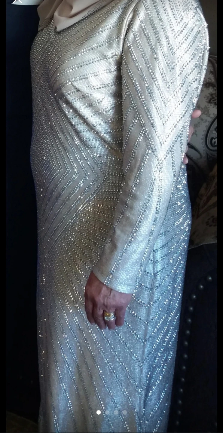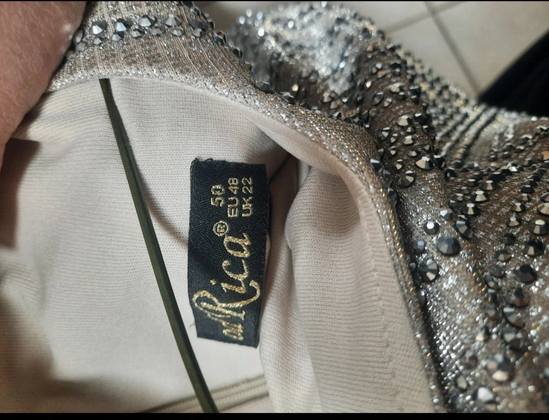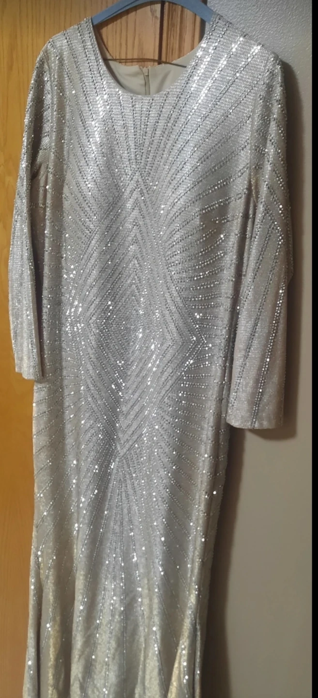This stunning Alica maxi dress is covered in sparkling embellishments. It features long sleeves and a floor-length silhouette, perfect for a special occasion. Size is 50 EU, 48 EU, UK 22.