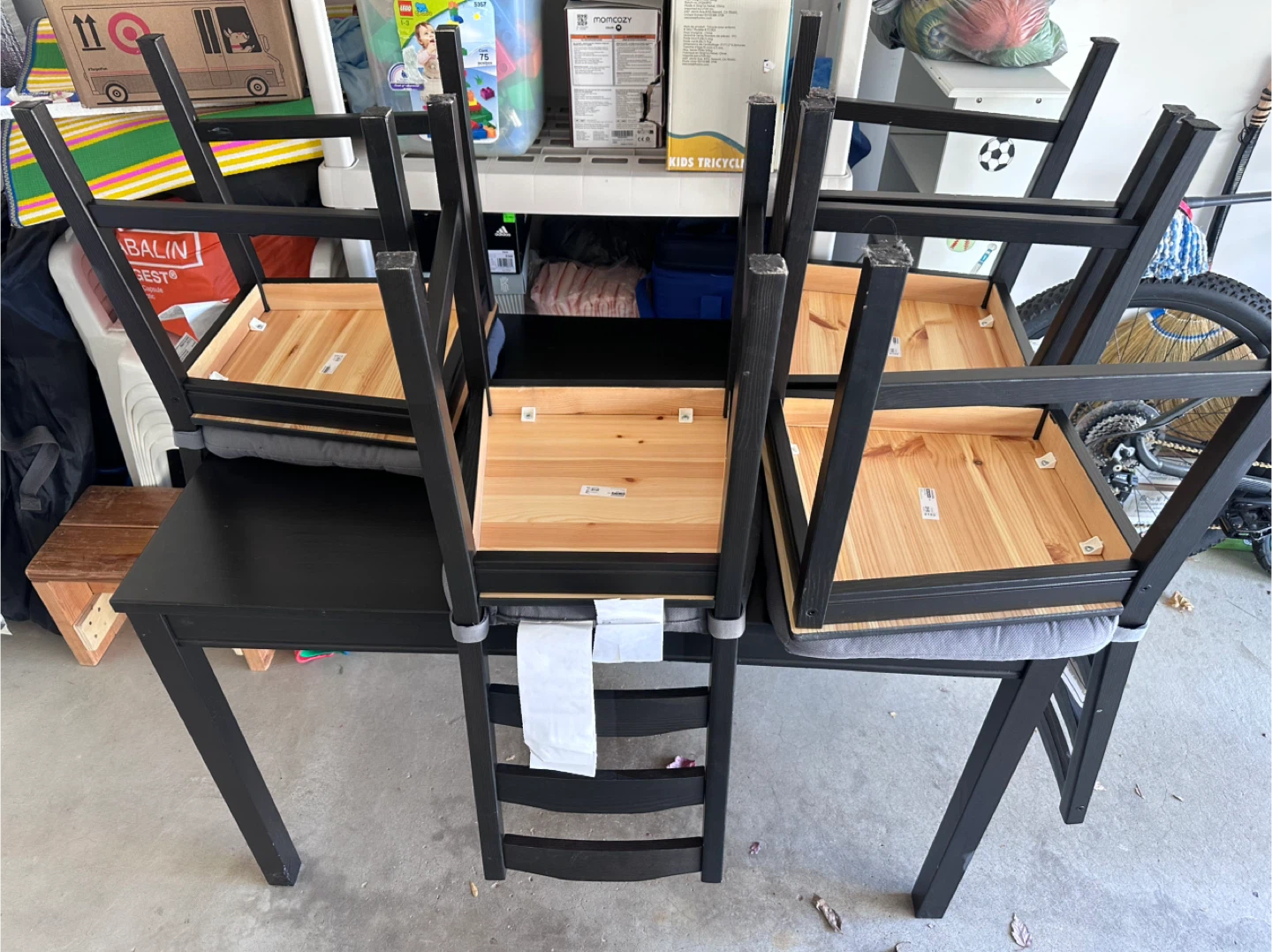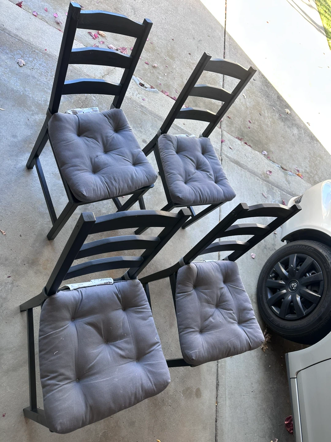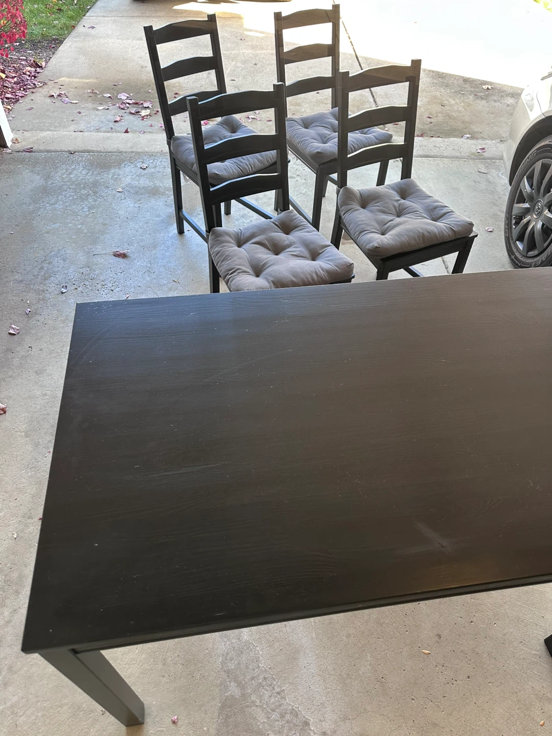 Selling a black dining table with four matching chairs. The chairs have gray cushions for added comfort. This set is perfect for a small dining area or kitchen. It's in good condition and ready for a new home!!