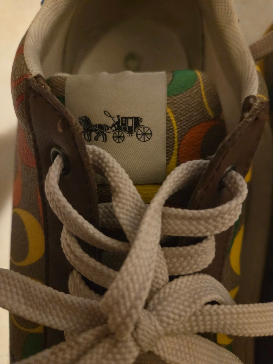Stylish Coach sneakers featuring the iconic signature pattern with a vibrant rainbow multi-colour overlay. These lace-up shoes have a classic low-top design. They're crafted with quality materials for comfort and durability.