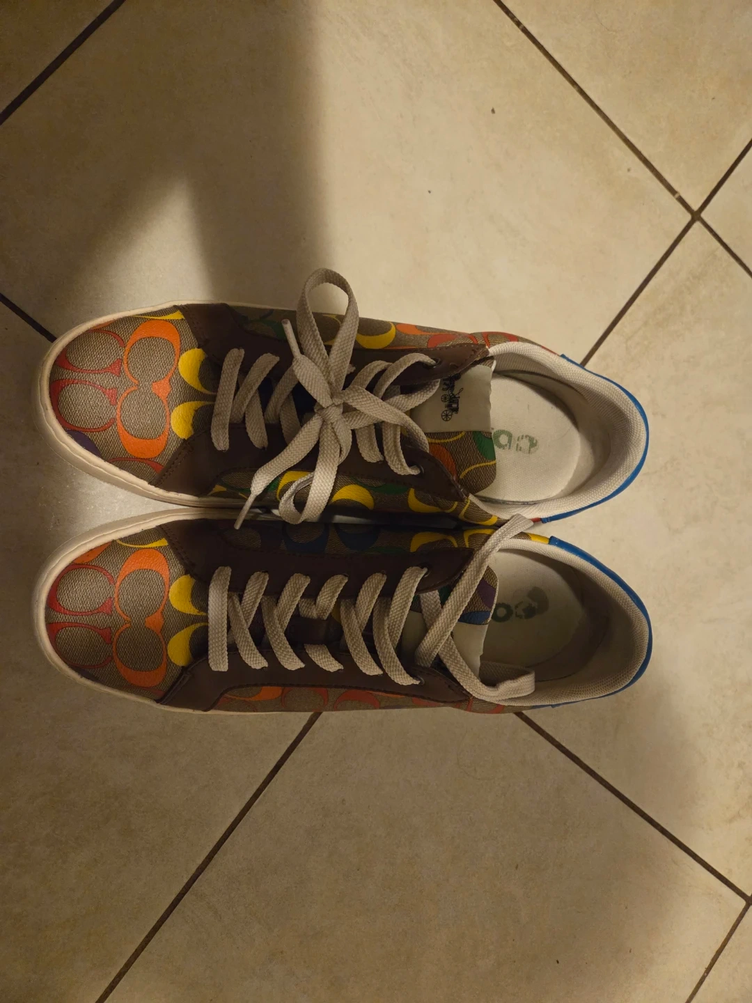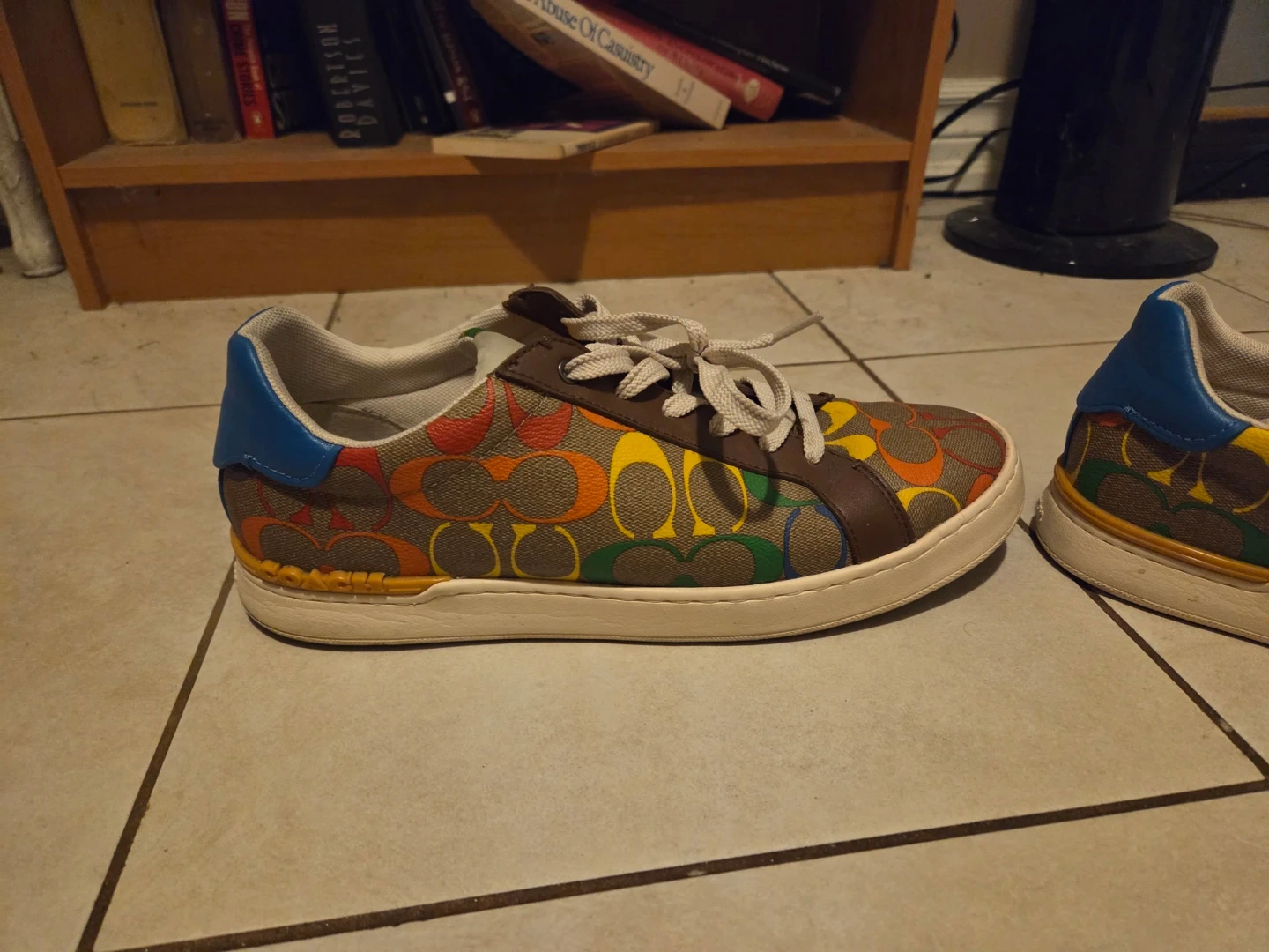 Stylish Coach sneakers featuring the iconic signature pattern with a vibrant rainbow multi-colour overlay. These lace-up shoes have a classic low-top design. They're crafted with quality materials for comfort and durability.
