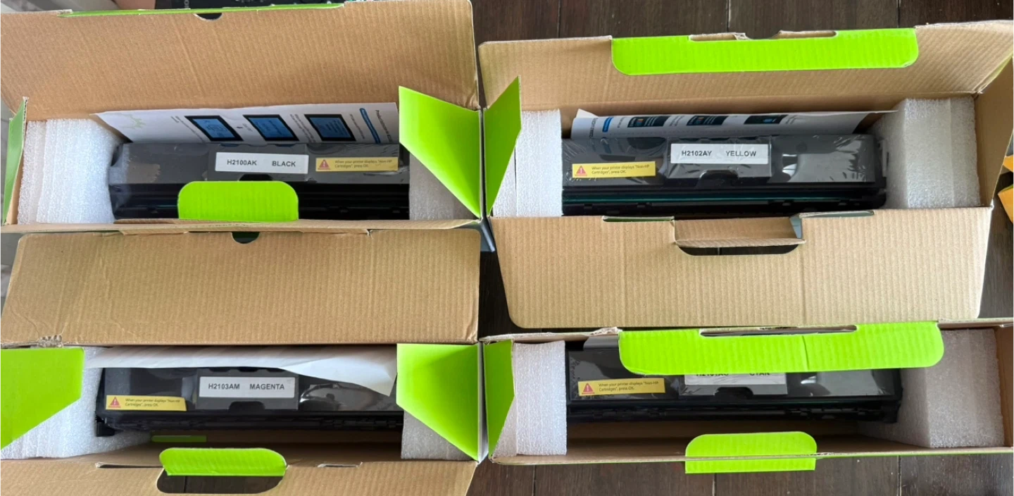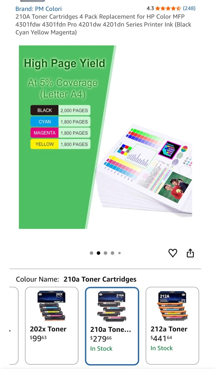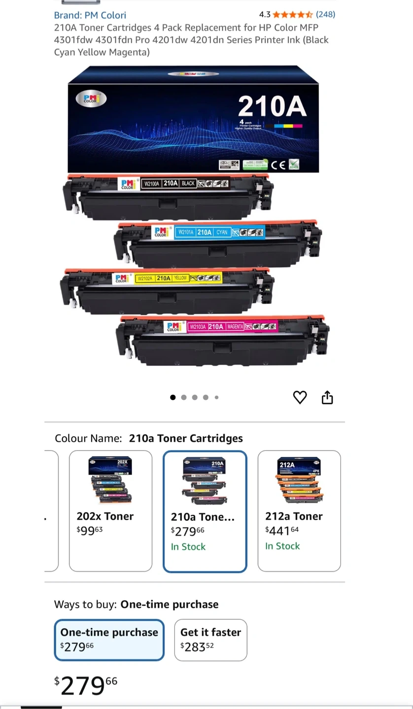 Selling a brand new, in-box set of PM Colori 210A toner cartridges! This is a 4-pack replacement for HP Color MFP 4301fdw, 4301fdn Pro 4201dw, and 4201dn series printers. Includes black, cyan, yellow, and magenta cartridges. Easy installation!