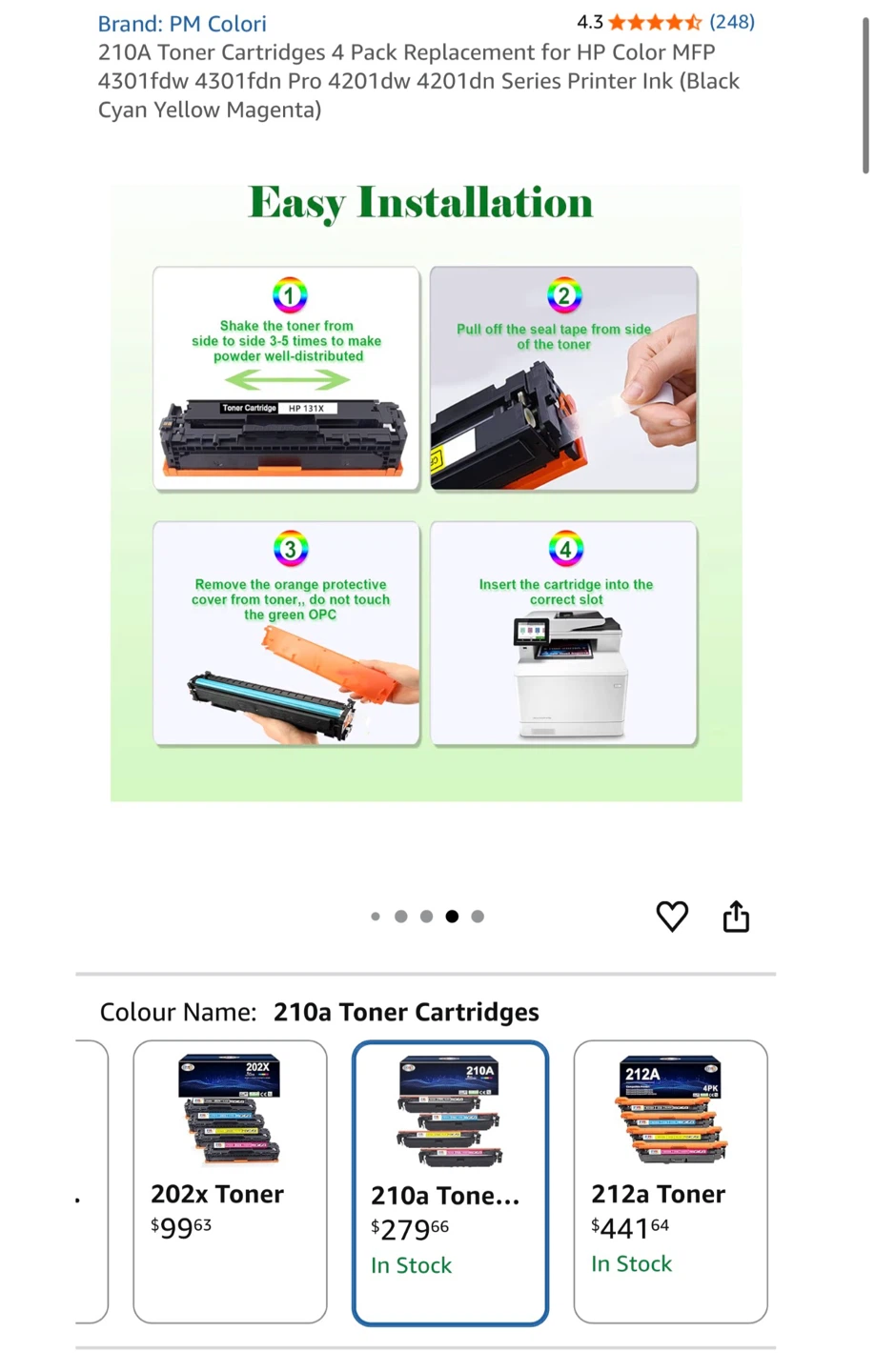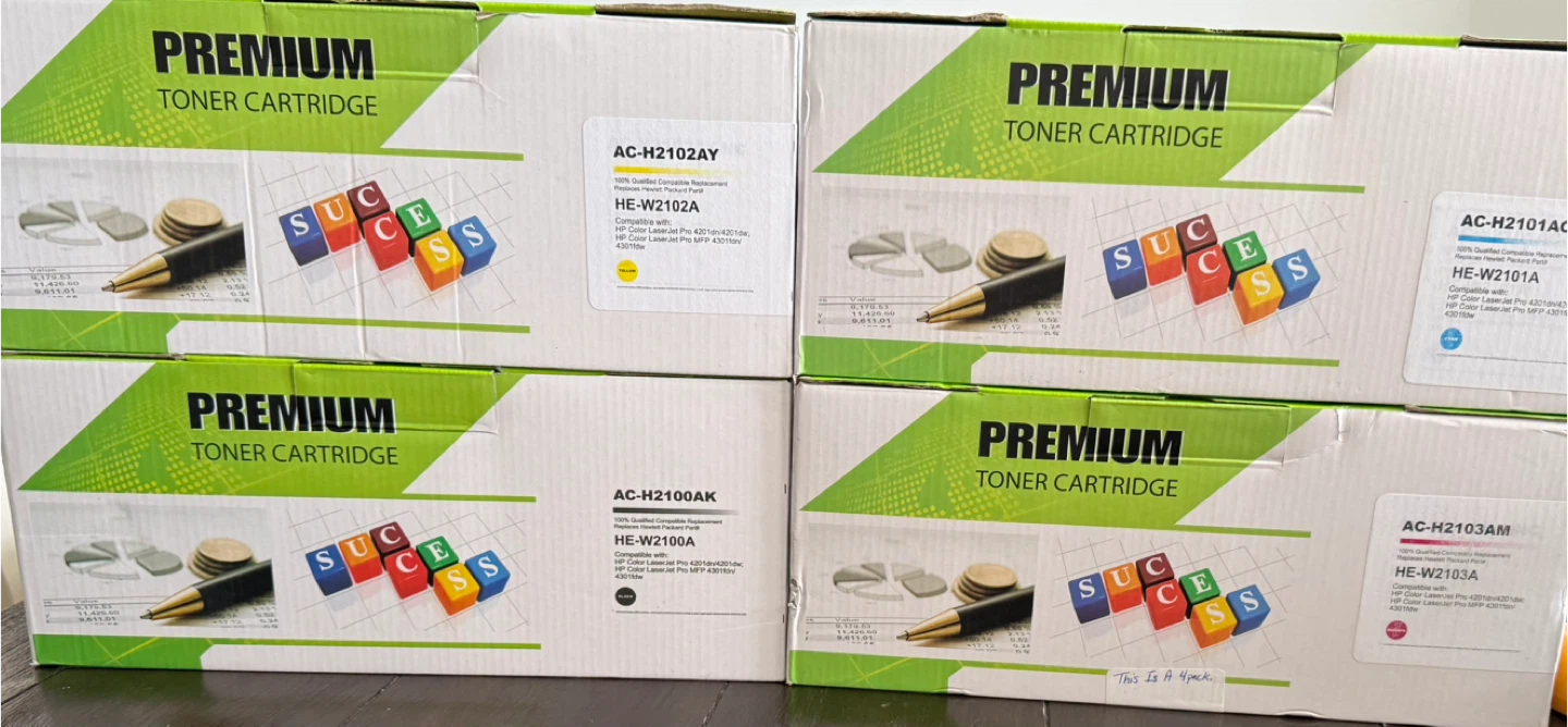 Selling a brand new, in-box set of PM Colori 210A toner cartridges! This is a 4-pack replacement for HP Color MFP 4301fdw, 4301fdn Pro 4201dw, and 4201dn series printers. Includes black, cyan, yellow, and magenta cartridges. Easy installation!
