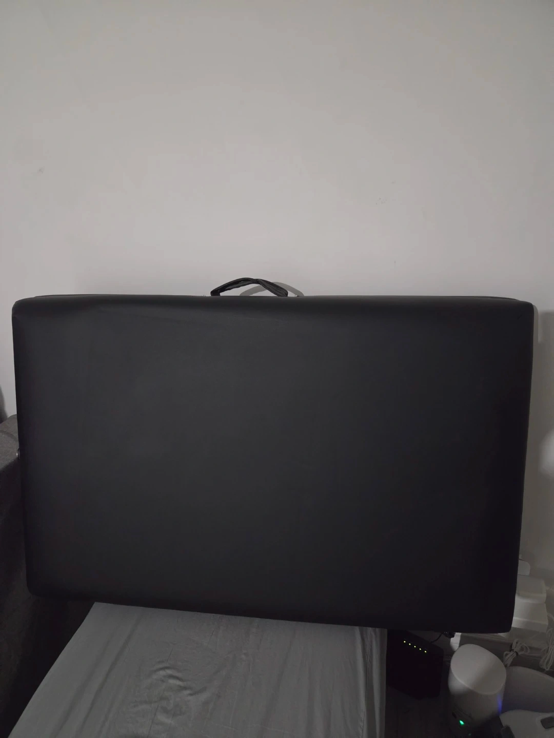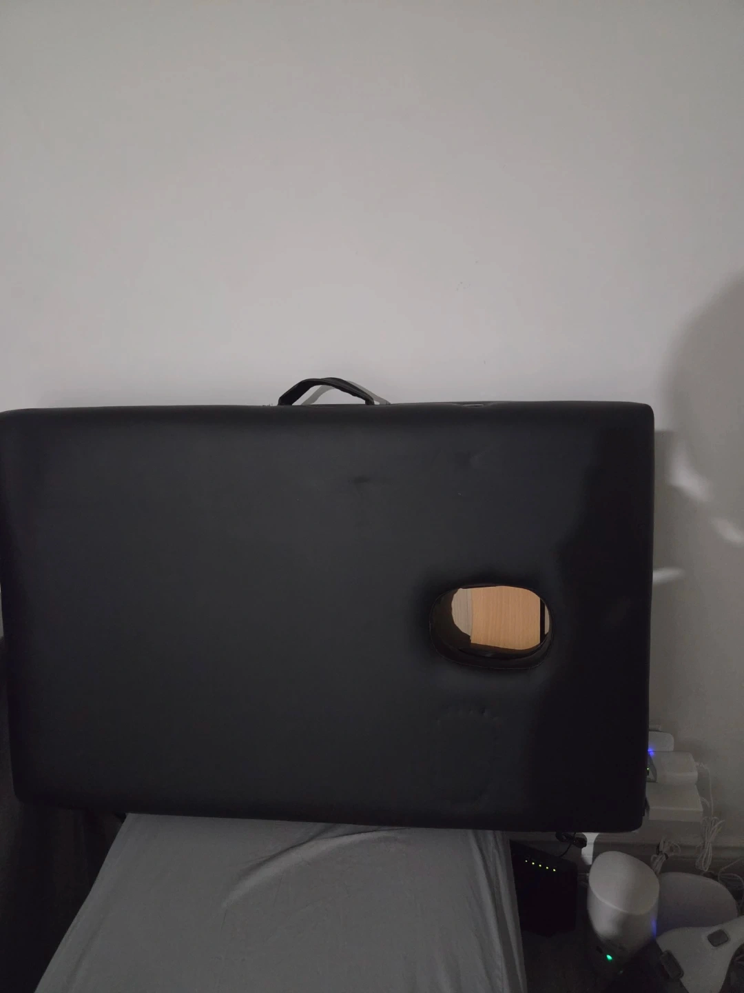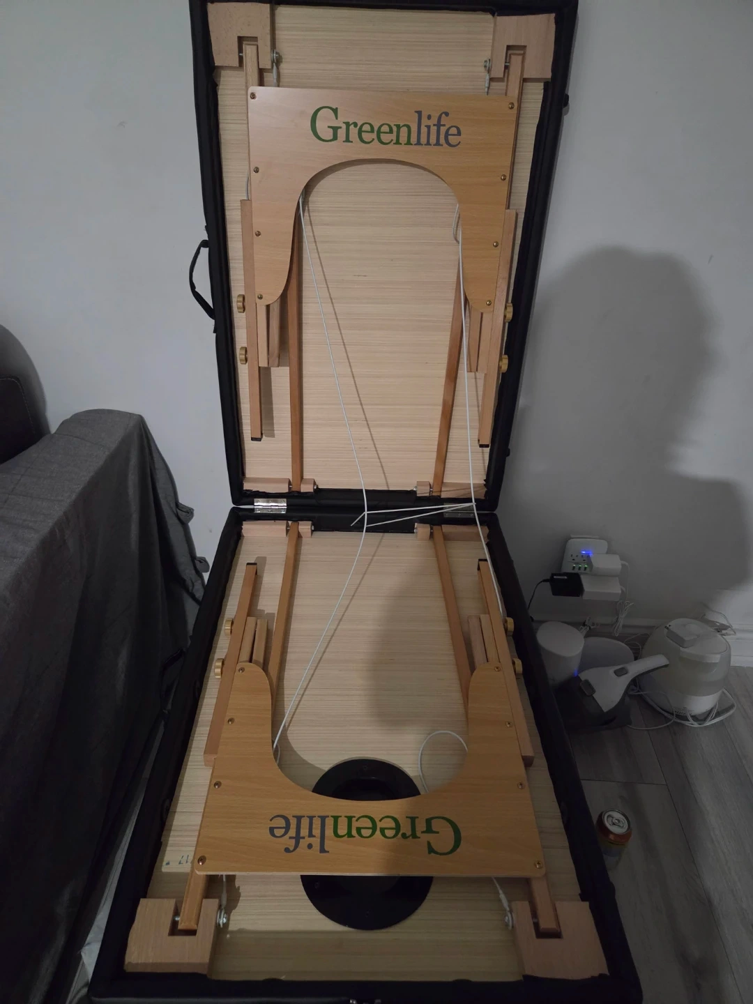 This is a Greenlife portable massage table. It has a face cradle and adjustable height. The table measures 185cm long and 70cm wide. The adjustable height ranges from 52cm to 82cm.