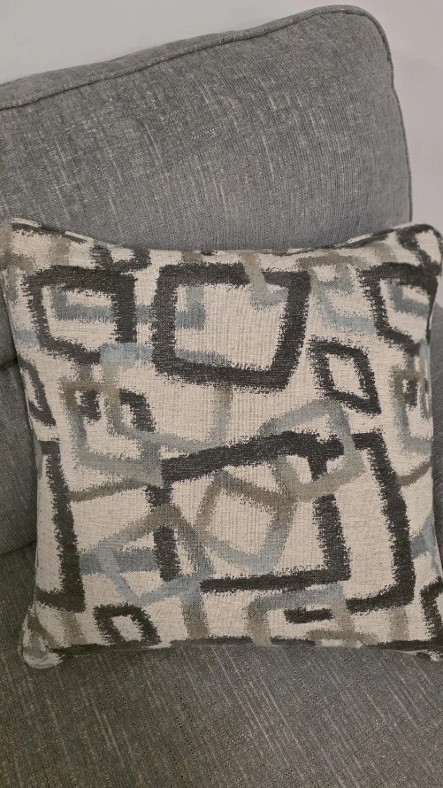 This is a comfortable three-seater sofa upholstered in a textured grey fabric. It includes two matching decorative pillows with a modern geometric pattern. The sofa has clean lines and a simple silhouette.