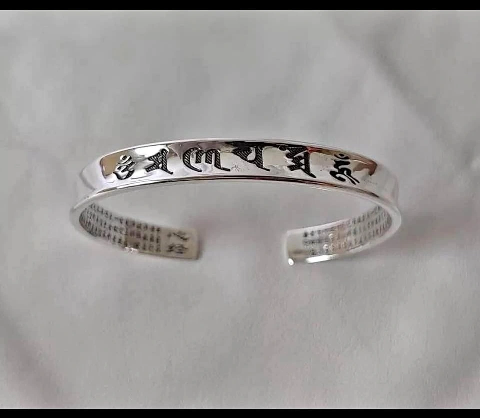 Brand new, never used 925 Sterling Silver unisex cuff bangle bracelet with Om Mani Padme Hum mantra amulet.