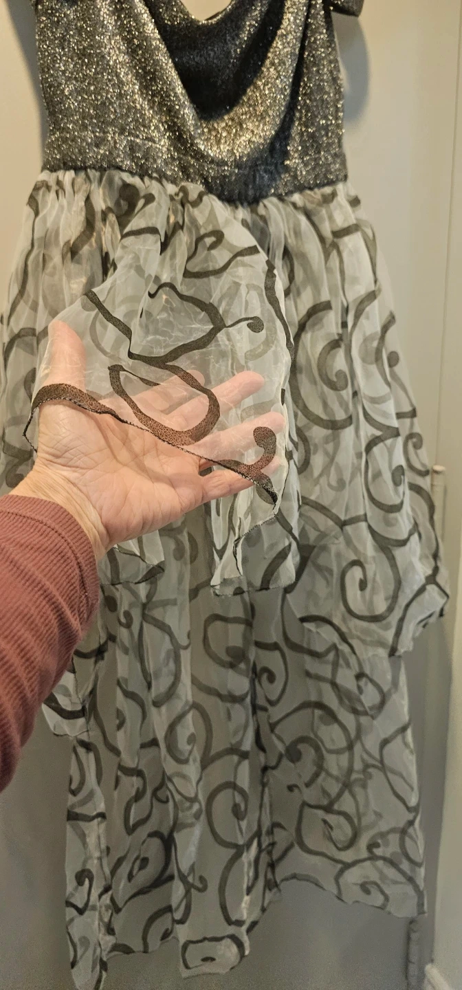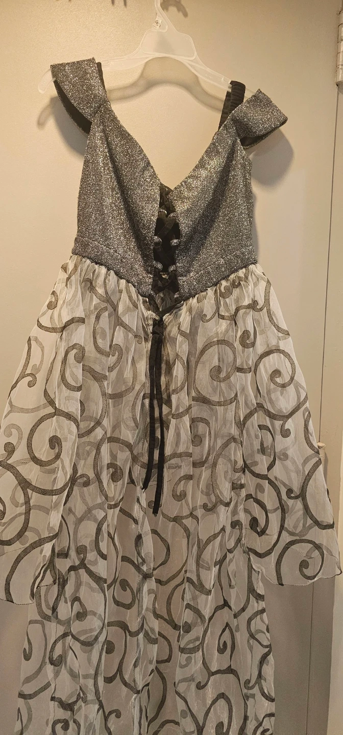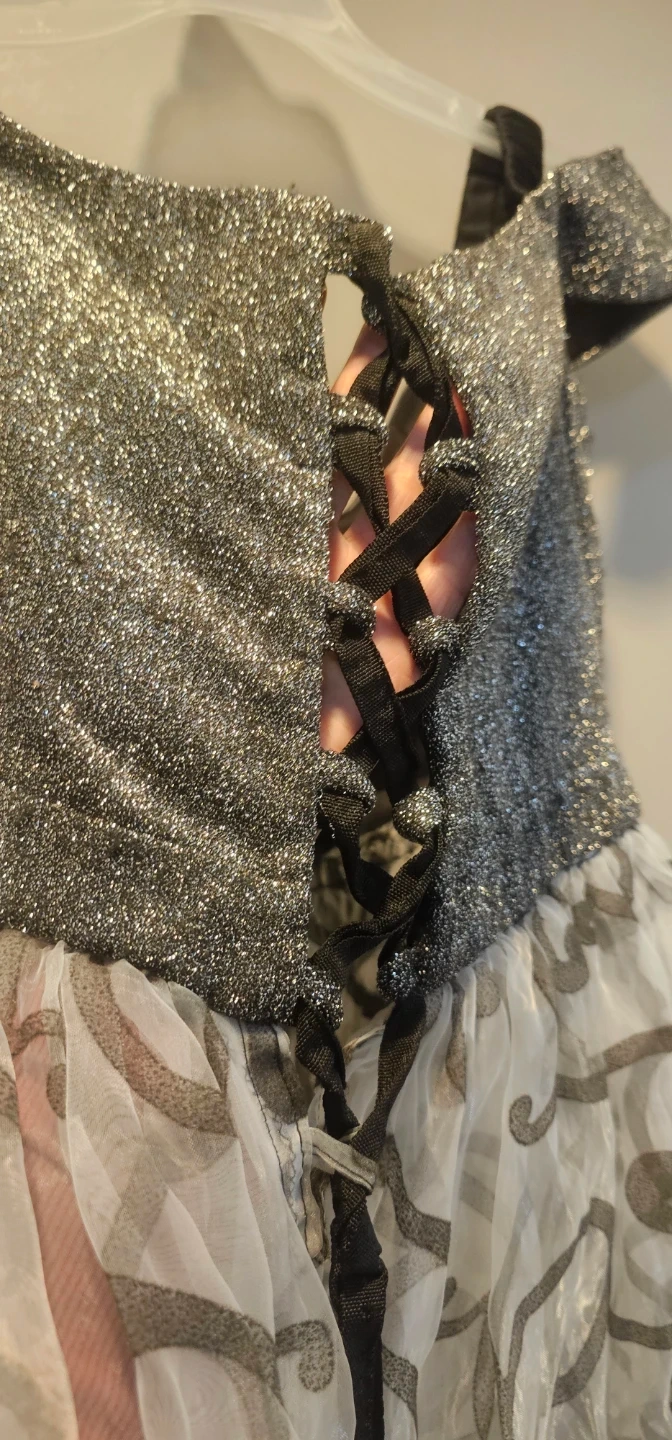 This sparkly off-shoulder dress features a glittery bodice and a tiered, sheer skirt with a swirl pattern. It has a corset-style lace-up back for adjustable fitting. Perfect for special occasions!