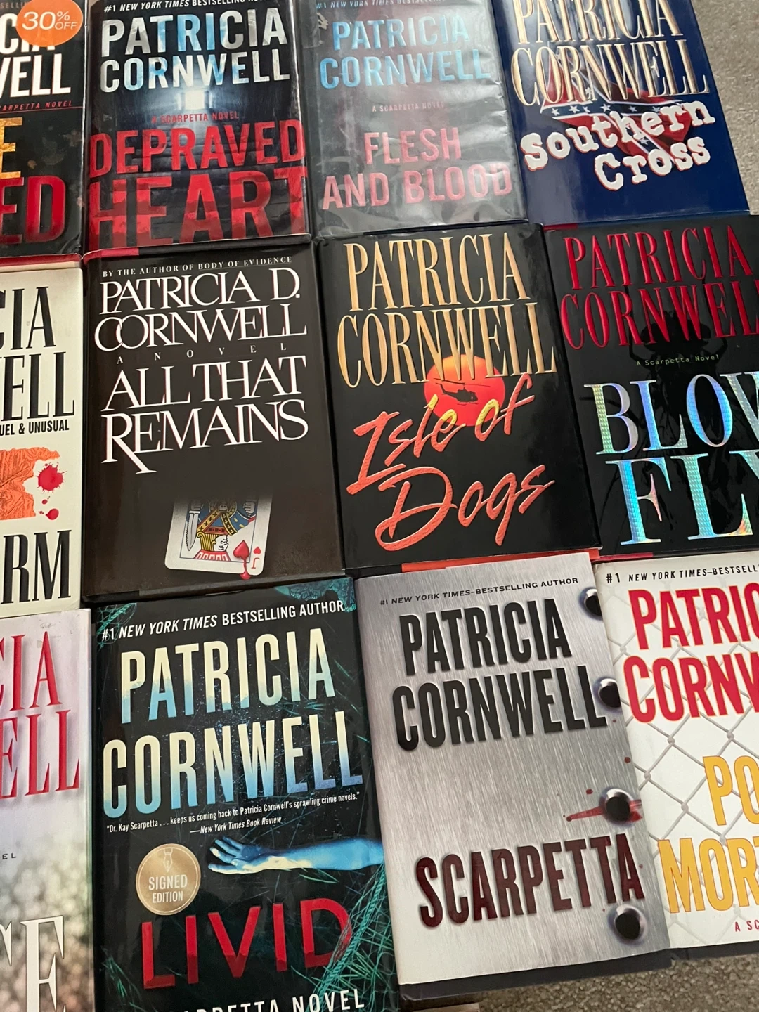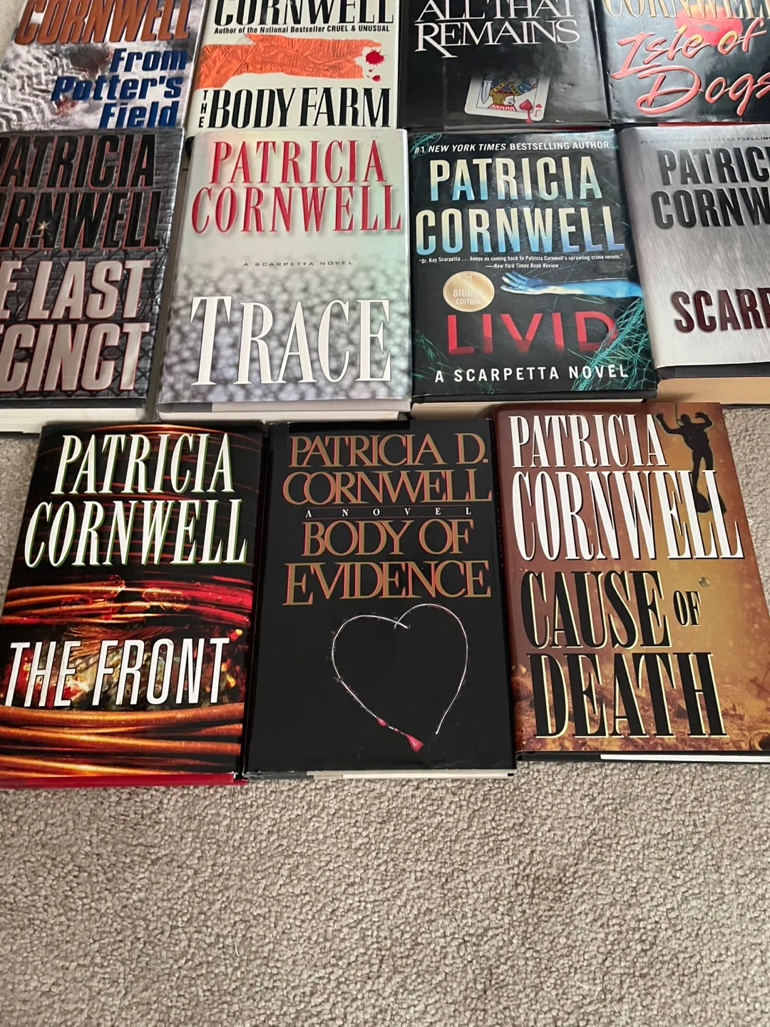 This is a collection of hardcover and paperback novels by bestselling author Patricia Cornwell. Titles include The Front, Body of Evidence, Cause of Death, Livid, Trace, and more. They're all Scarpetta novels, offering thrilling crime fiction. Great for mystery and thriller readers! Total of 18 books only read once still in great condition for people who love to read books cash only please no e-transfers thank you