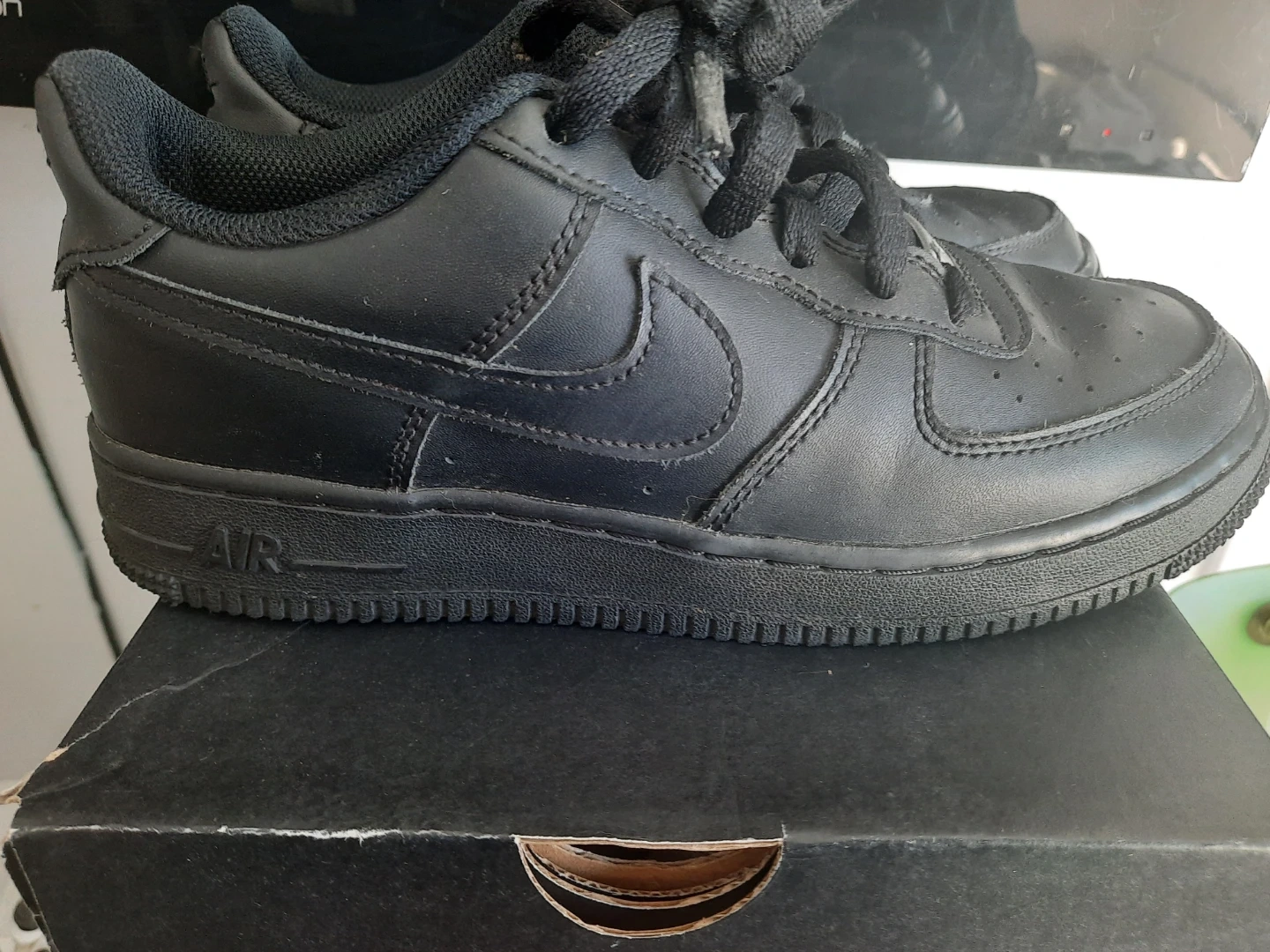 Classic black Nike Air Force 1 '07 sneakers. These are a staple for any sneaker collection. Leather upper with rubber sole for durability.