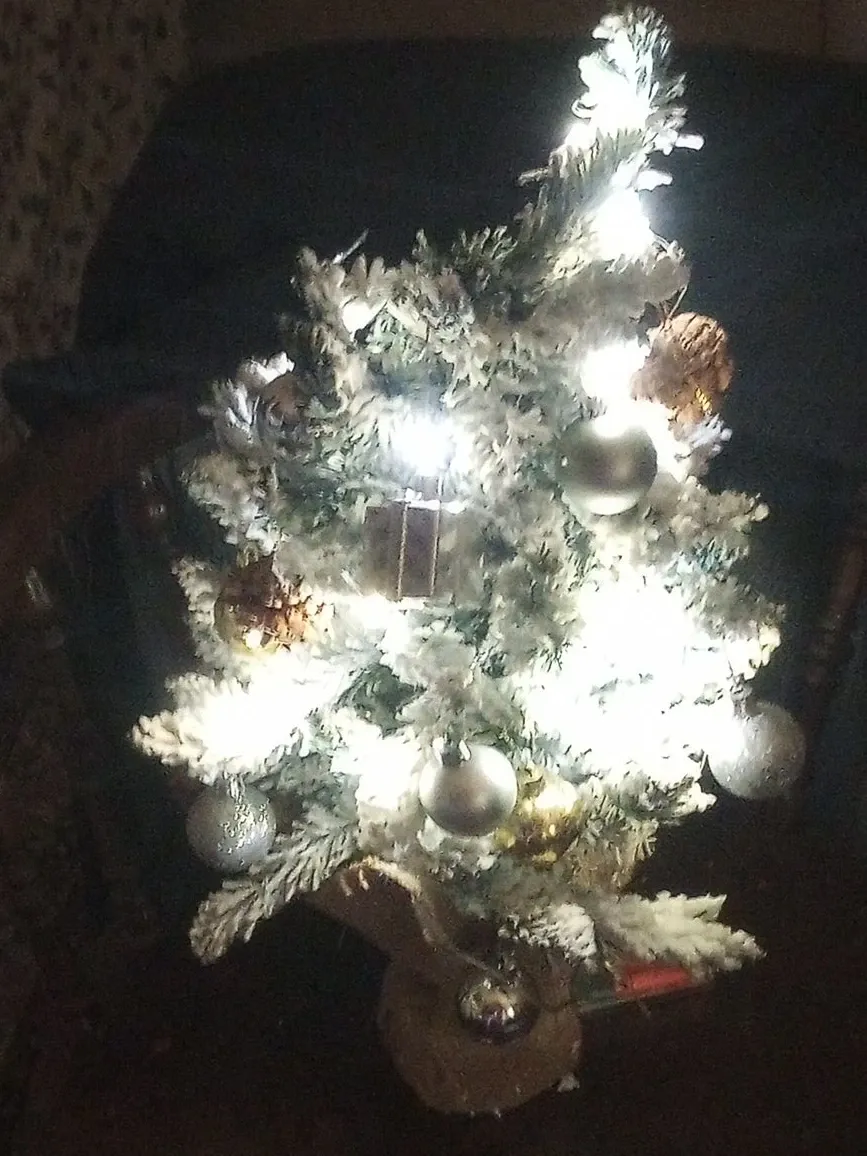 Selling a small Christmas tree, already decorated with lights and ornaments. It's perfect for adding a festive touch to a small space during the holidays